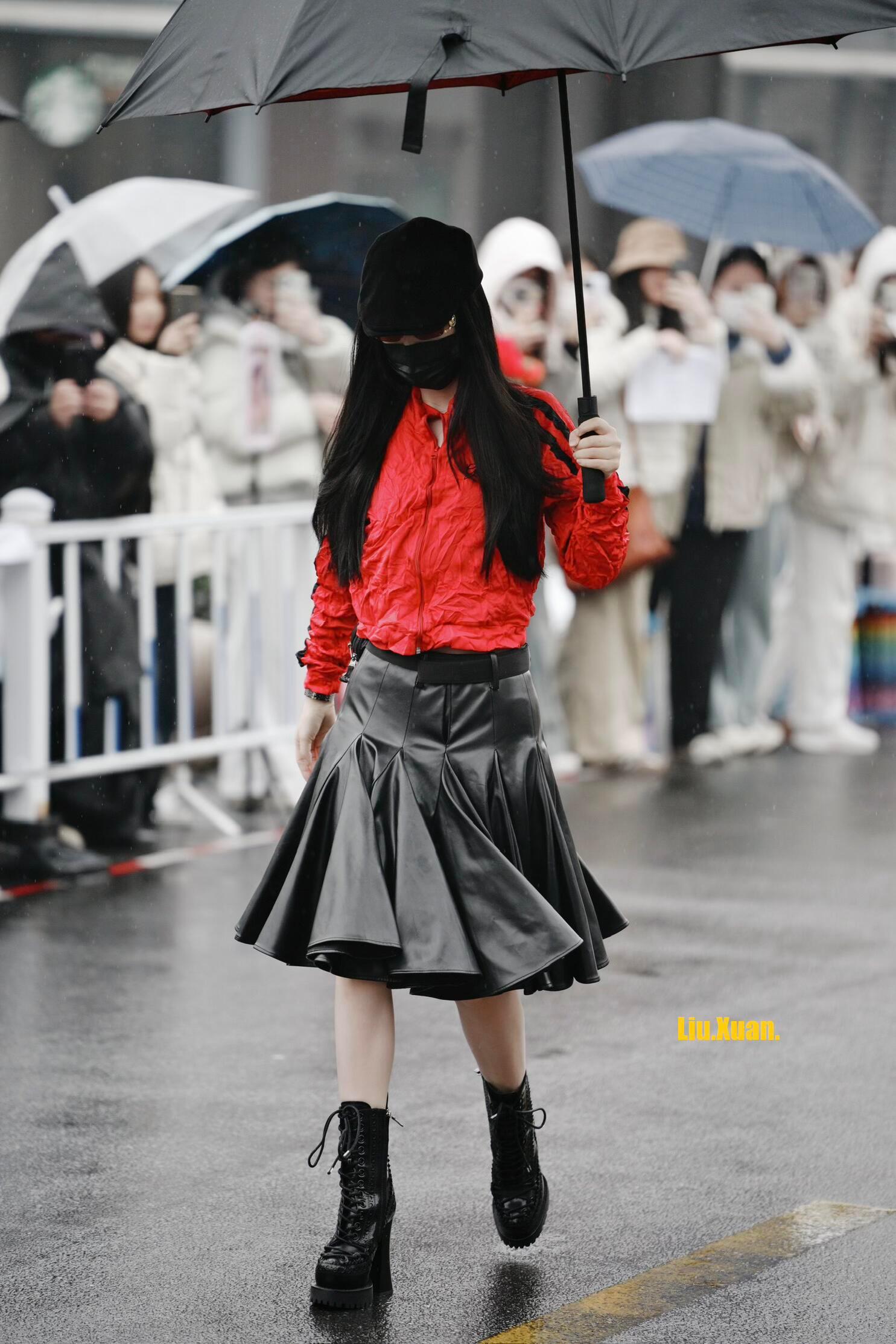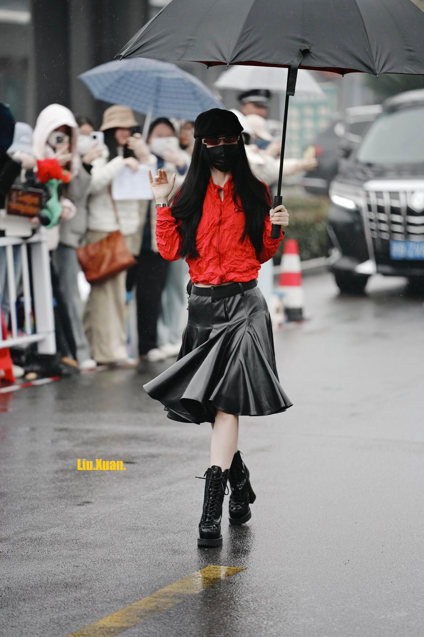 虞书欣《云初令》上班路透,亮面红夹克+皮质百褶裙又美又飒