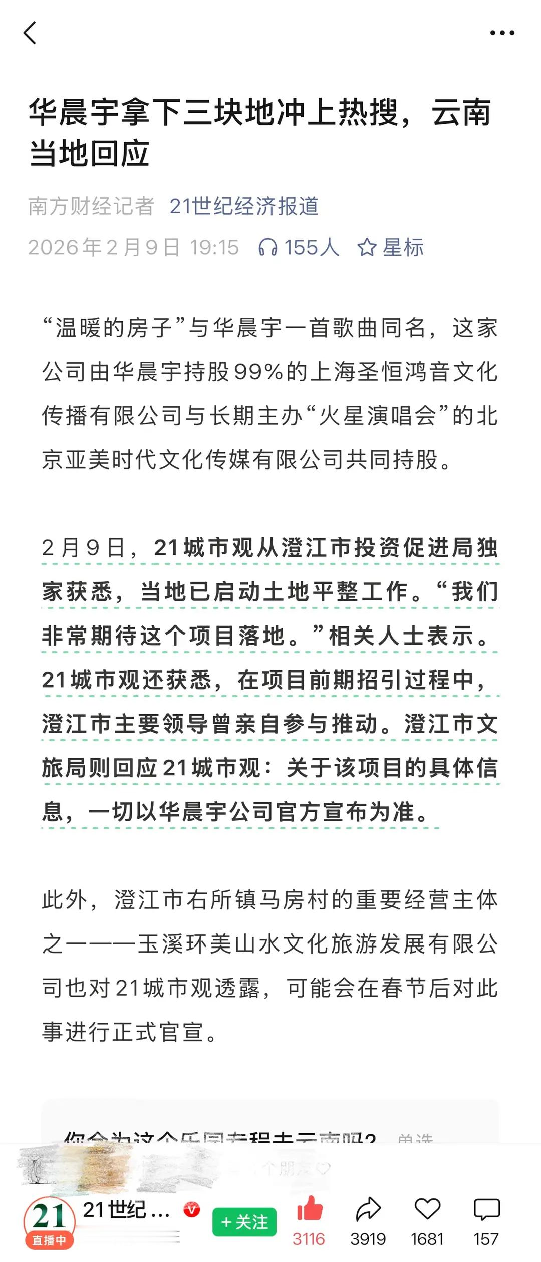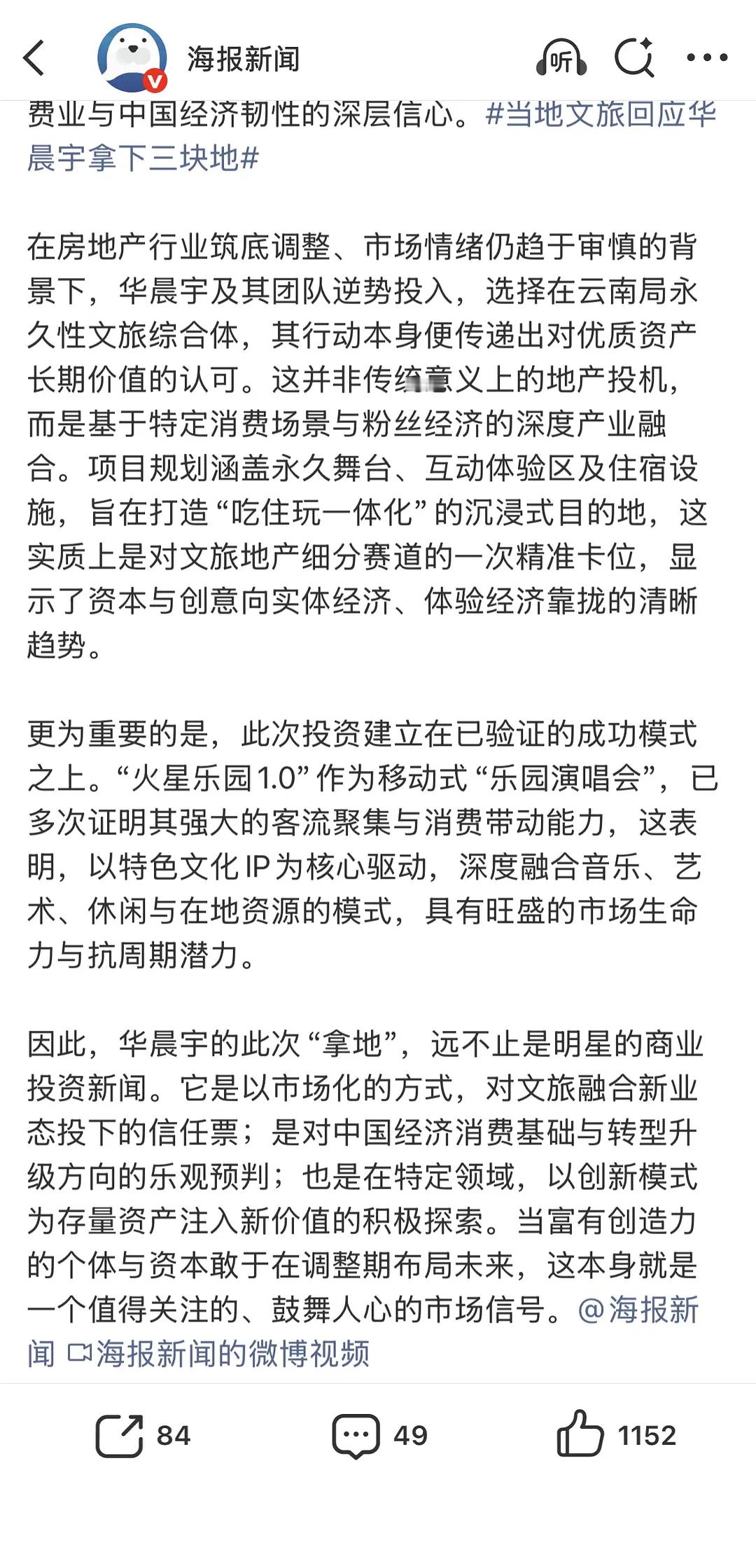 华晨宇拿下三块地有🐏媒背书,当地文旅亲自推动支持表示:“非常期待项目落地”