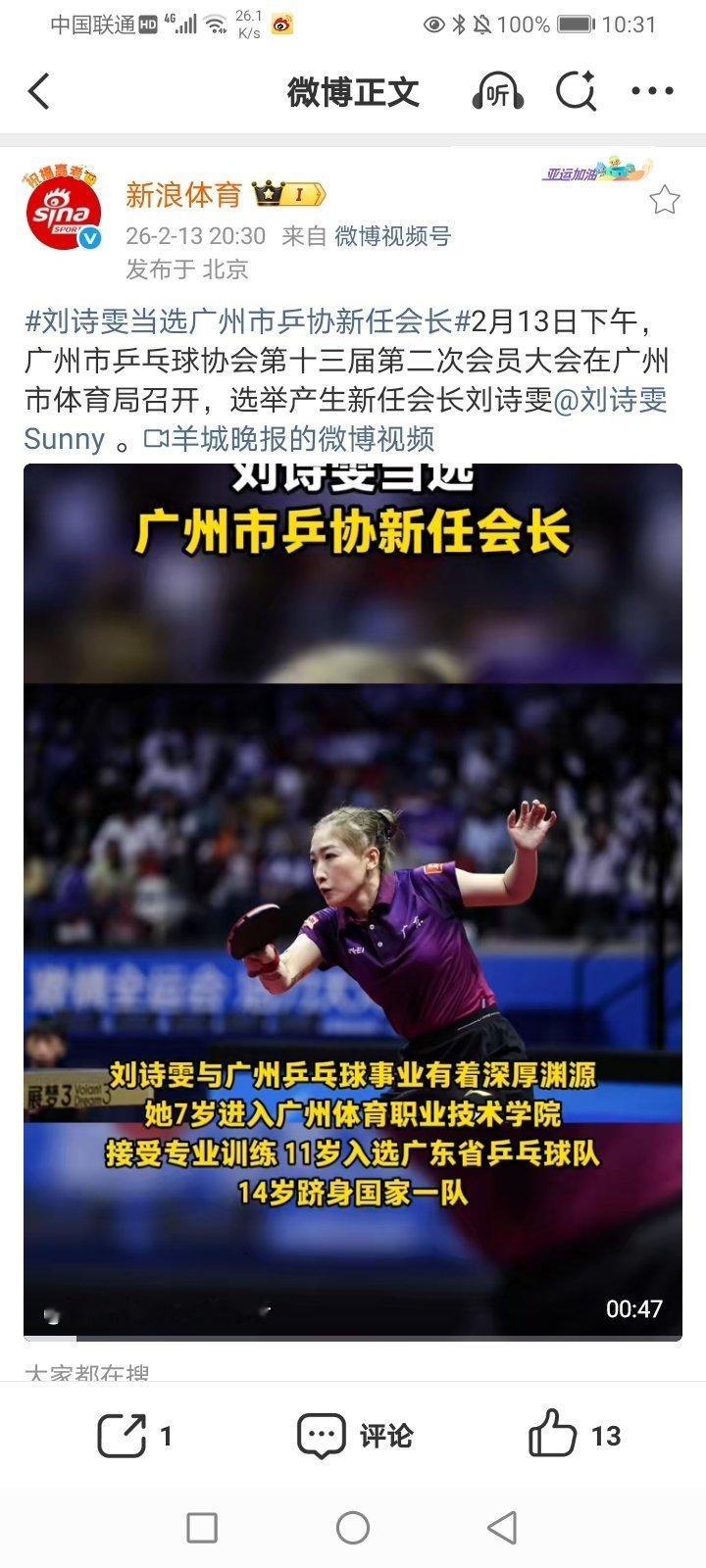 还在替刘诗雯惋惜?省省吧。人家根本不需要你的同情。你以为她当选这个广州乒协会