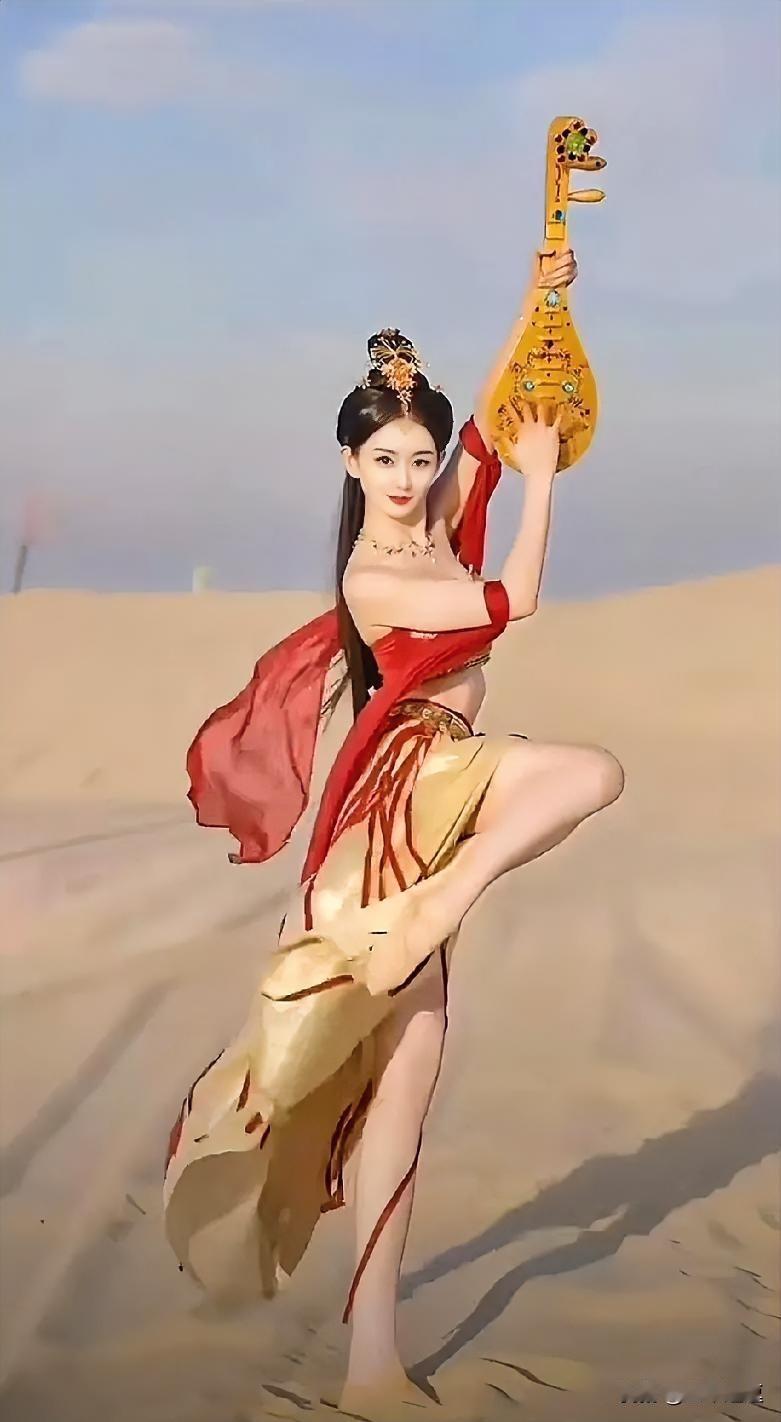 沙漠中的古典舞者,红衣飘逸,古筝相伴,韵味十足。一