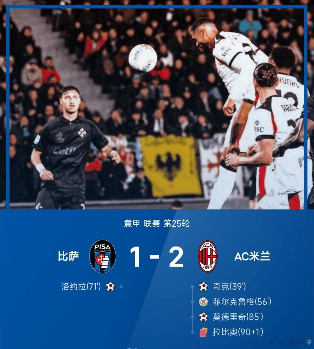 比萨1比2AC米兰意甲五大联赛每日足球推荐 AC米兰2-1战胜比萨,上半场迈尼昂扑单刀,奇克头球破门,下半场拉比奥进球被吹,菲尔克鲁格失点,洛约拉扳平,莫德里奇绝杀,拉比奥两黄变一红罚下。