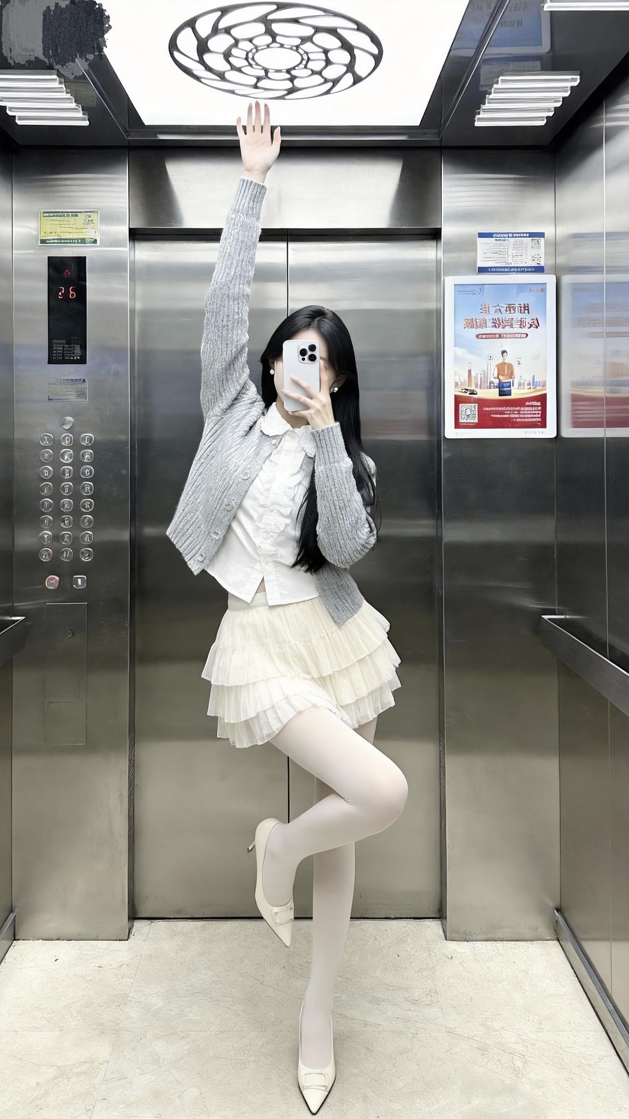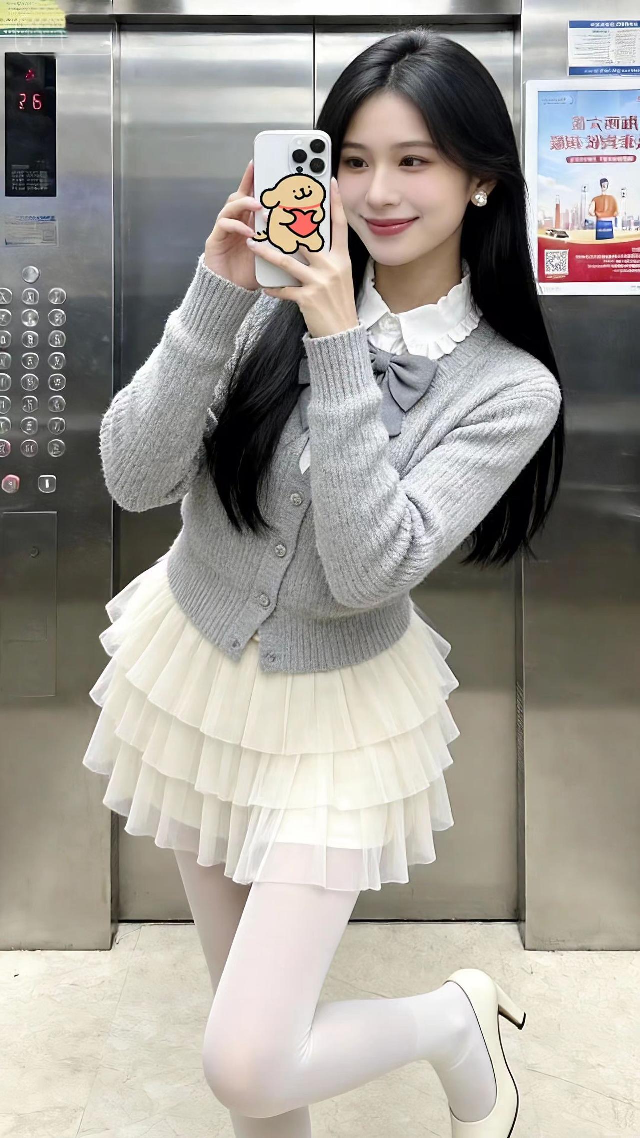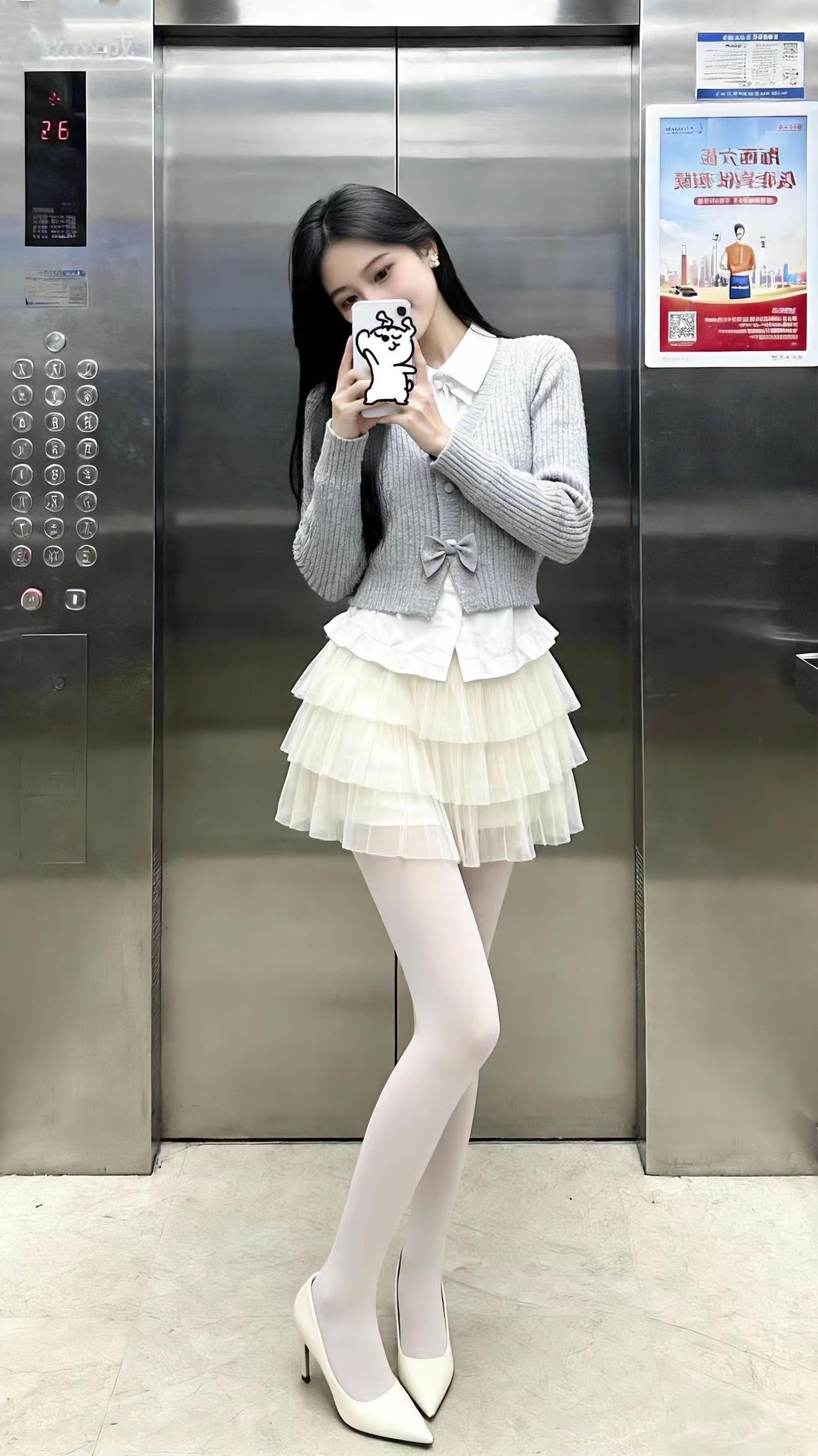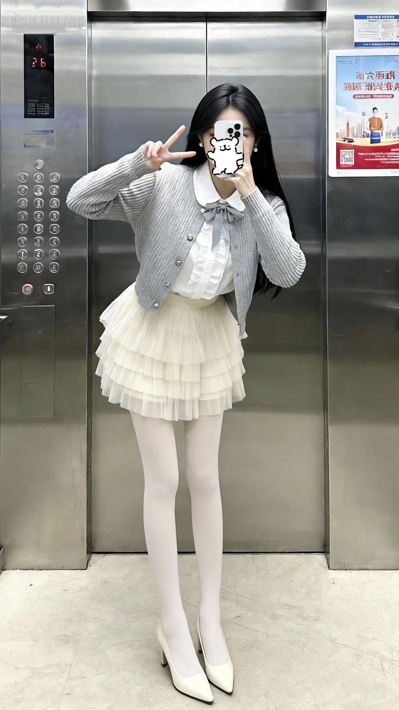 奶灰开衫裹着软乎乎的温柔,蓬蓬纱裙一摆像把云朵穿在了身上~白丝袜配尖头鞋,甜里藏着轻熟的精致!这种仙气软甜风你们爱了吗?穿搭 甜美穿搭 甜妹 电梯拍照