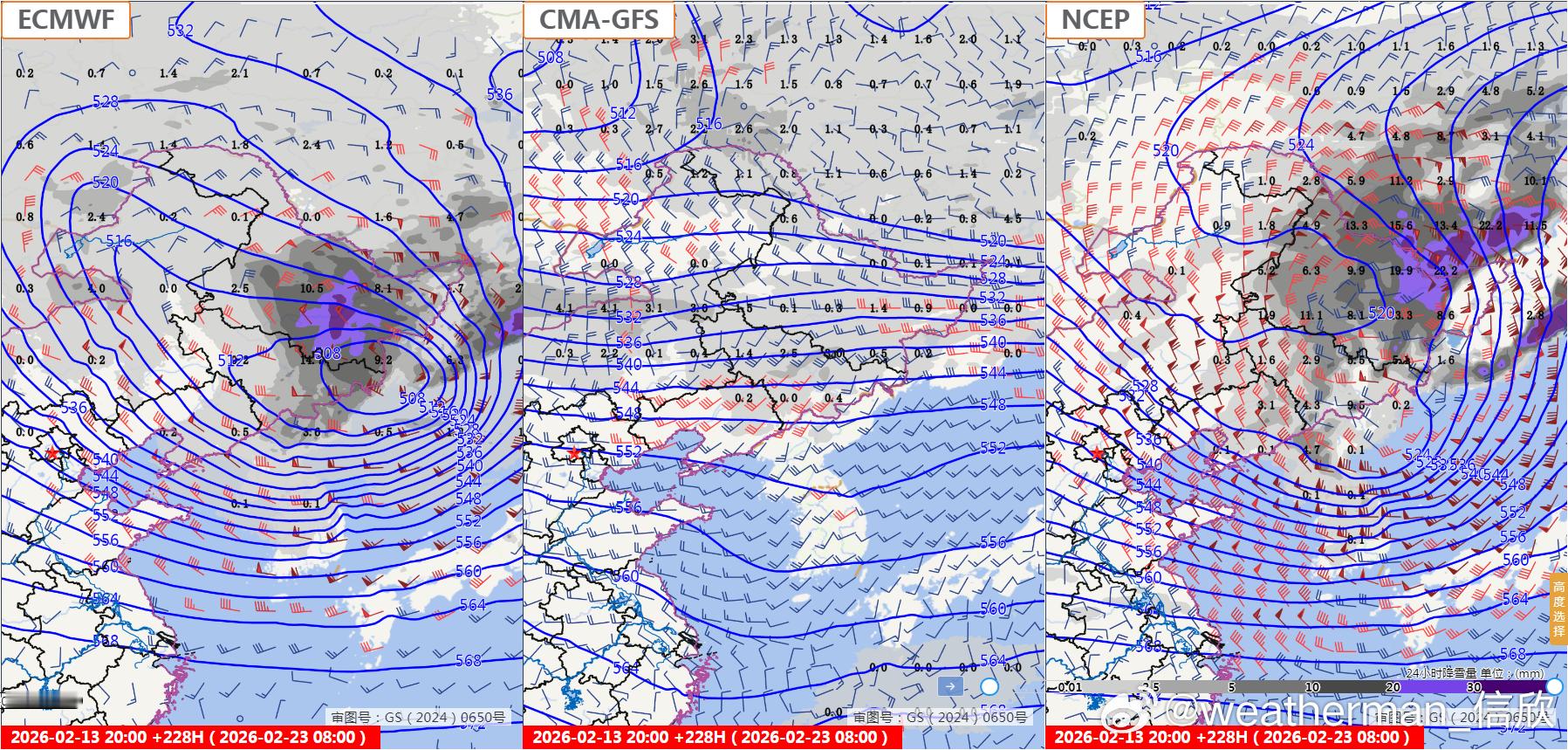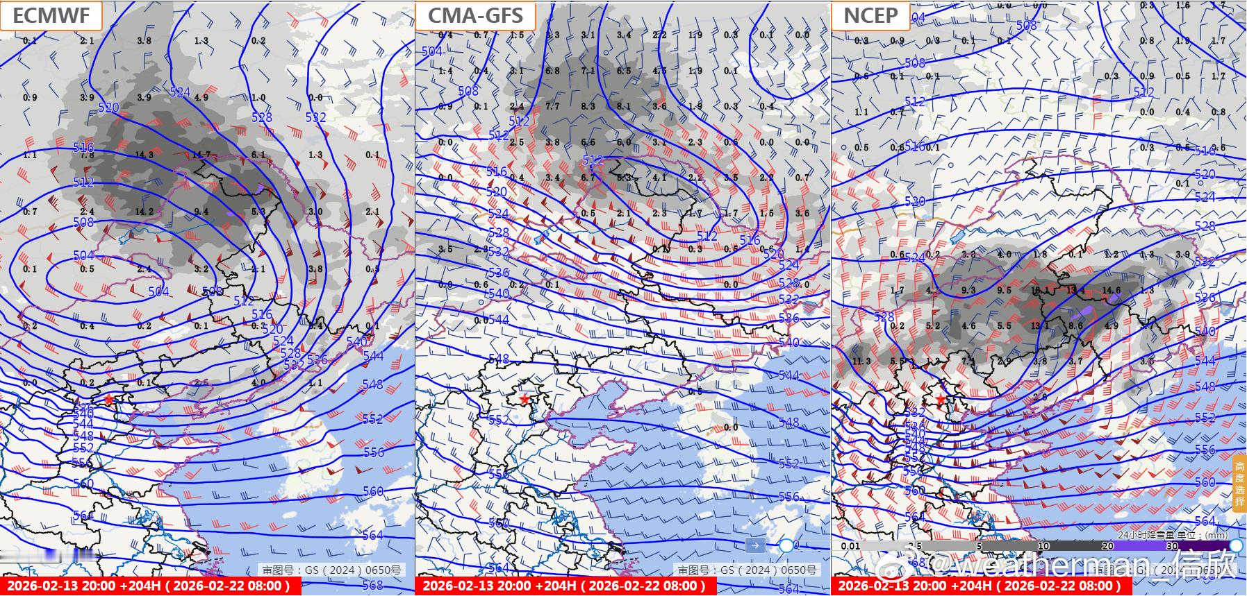 【强降雪展望】目前预报看,春节假期后段(21日白天-23日晨),内蒙古东部和黑龙江存在强降雪的可能。但因为时效远,模式预报之间也有分歧,这个预报还不能定论,但需要做好应对准备。图2为欧洲、我国、美国三家预报的21日08时-22日08时降雪量,图4为22日08时-23日08时,欧美数值给出的雪较大,我国数值报的雪不明显。后期继续关注形势演变,尤其是高空槽/冷涡以及地面气旋发展的情况。