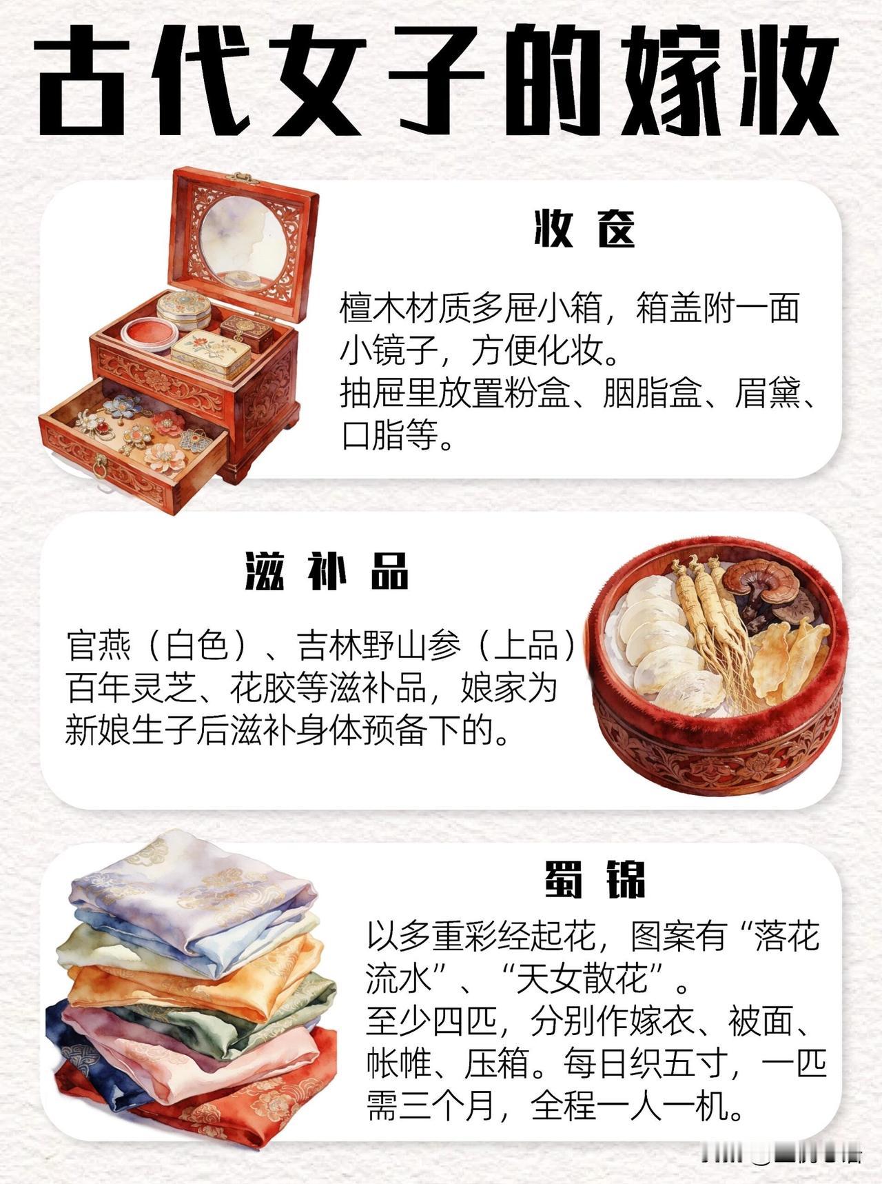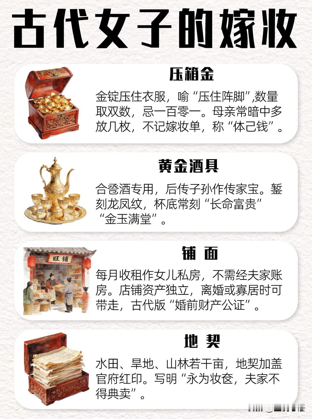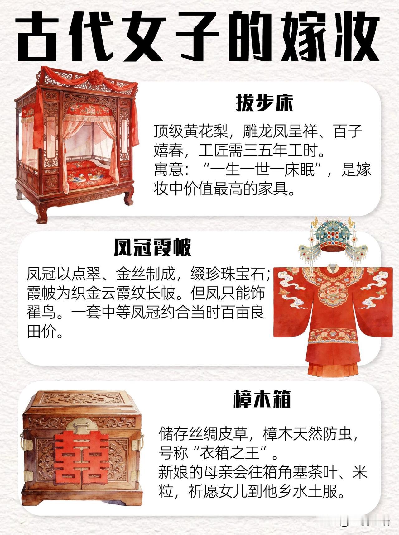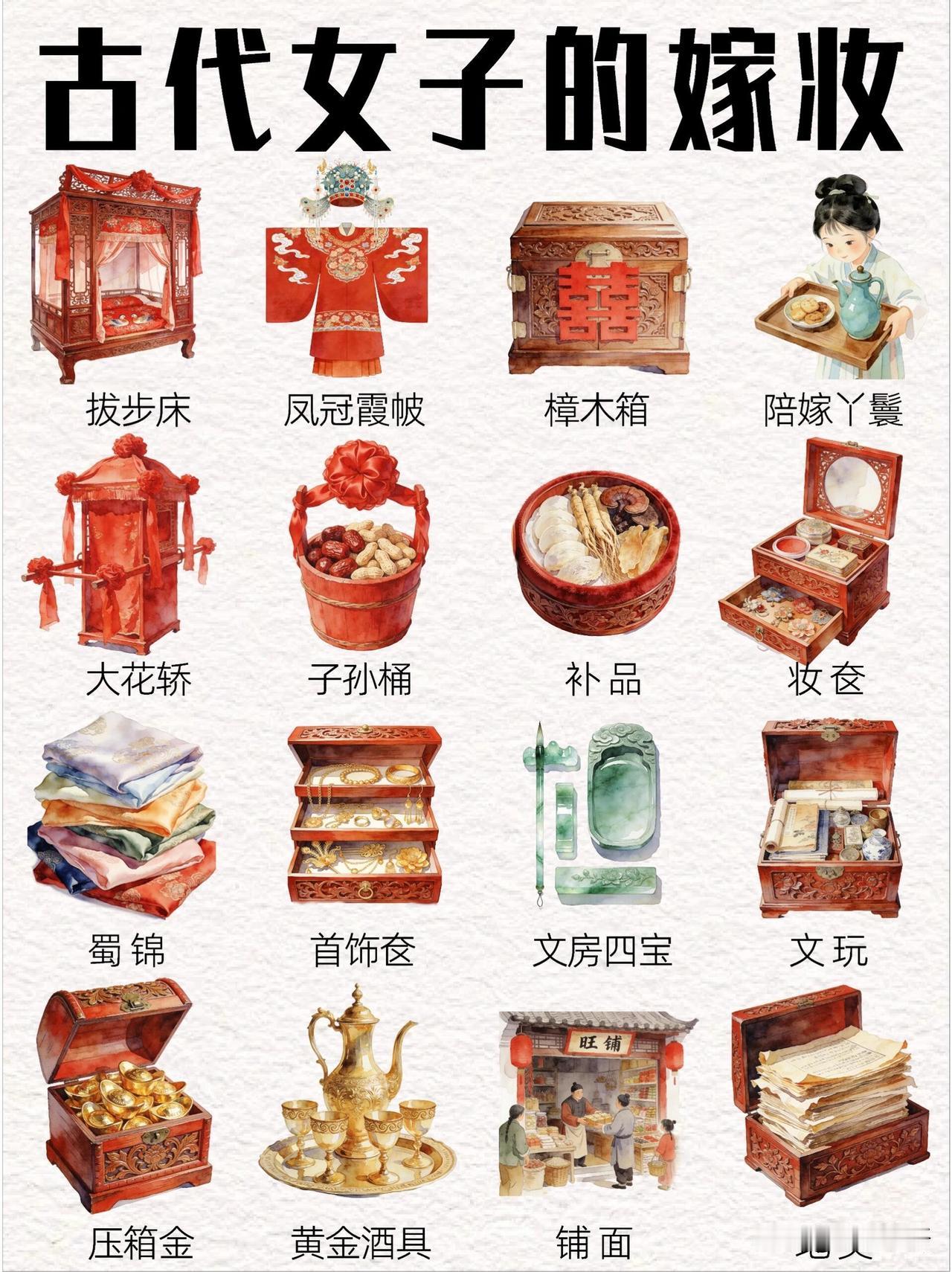 古代女子的嫁妆,老祖宗的智慧太绝了 真的被古代大户人家女子的嫁妆惊艳到!这哪里是陪嫁,分明是娘家给的底气和保障啊! 拔步床雕龙画凤,是嫁妆里的顶配,寓意一生一世的安稳;凤冠霞帔珠光宝气,一套就值百亩良田,排面拉满。樟木箱藏着母亲的期许,子孙桶装着早生贵子的祝福,蜀锦、首饰奁件件精致,全是娘家的用心。 最佩服的是老祖宗的通透!陪嫁的铺面、地契,明明白白写着是女儿私产(类比如今的婚前财产)夫家不能动,妥妥的古代婚前财产公证。还有压箱金、体己钱,都是给女儿留的后路。 原来从古至今,娘家的爱都是一样的。不是攀比排场,而是让女儿在婆家腰杆硬,有退路,被善待。这份藏在嫁妆里的智慧和偏爱,真的太贴心了! 古代女子的嫁妆