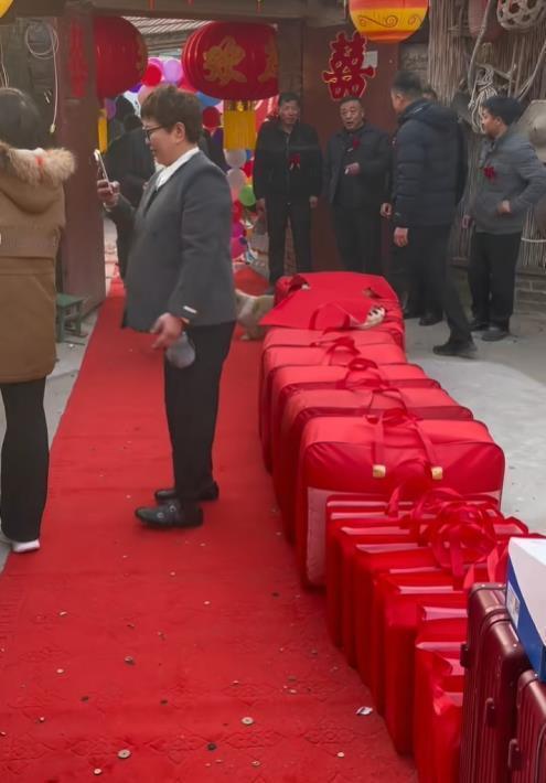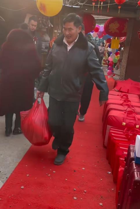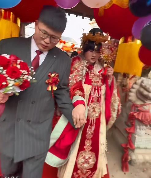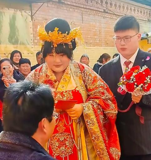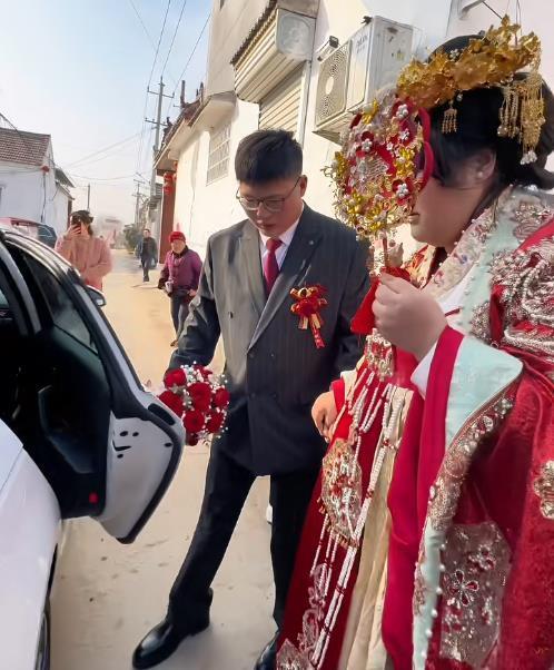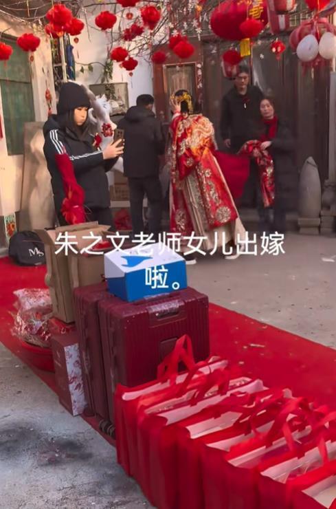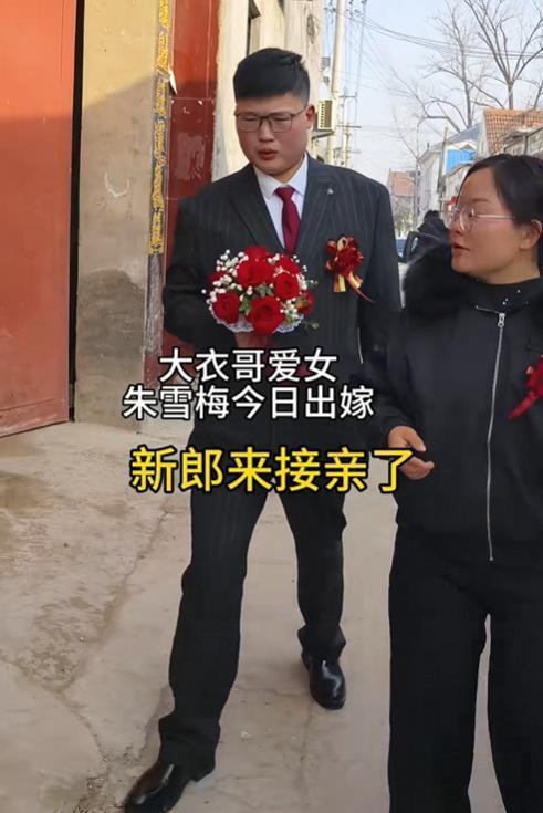 2月13日,大衣哥女儿朱雪梅结婚,这事儿一下成了全网焦点。新郎一表人才,是邻村帅气小伙,年纪轻轻还事业有成,大衣哥和大衣嫂超满意。 迎亲那天,新郎手捧红玫瑰,和姐姐去接亲,迈着大步自信走进大衣哥家。迎亲队伍全是豪车,带头的是带四个圈标志的车,车头绑着大红花,场面超有范儿。村里热闹非凡,大家都等着新郎发喜糖。 朱雪梅穿凤冠霞帔,端庄羞涩。大衣哥给女儿的嫁妆价值过百万,还不算给女婿的房产等支持。朱之文曾说选女婿重人品,这对新人看着郎才女貌,祝福他们幸福长久!