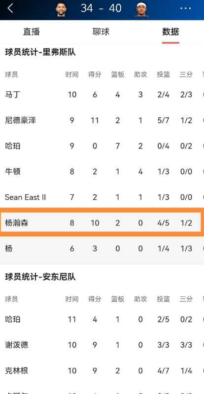 全场比赛下来,杨瀚森替补出战8分钟,投篮5中4,其中三分球2中1、罚球1中1狂砍10分2篮板。