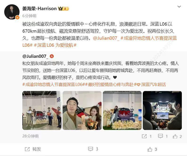 情人节最动人的礼物,从来不是刻意的浪漫,而是把真心和安全感一起送到对方身边…看这位成渝小伙的眼光,到位了!情人节直接送女友一台深蓝L06,高颜值轿跑造型吸睛又有格调,后置后驱带来流畅好开的驾控体验,再加上超长续航,跨城通勤、异地见面都轻松无焦虑。不用再为距离发愁,不用再担心续航受限,车不仅是代步工具,更是陪伴与牵挂。把爱意藏在每一次出行里,用实力宠着对方,这才是情人节最实在、最暖心的浪漫~成渝异地恋情人节喜提深蓝L06深蓝L06 为爱续航