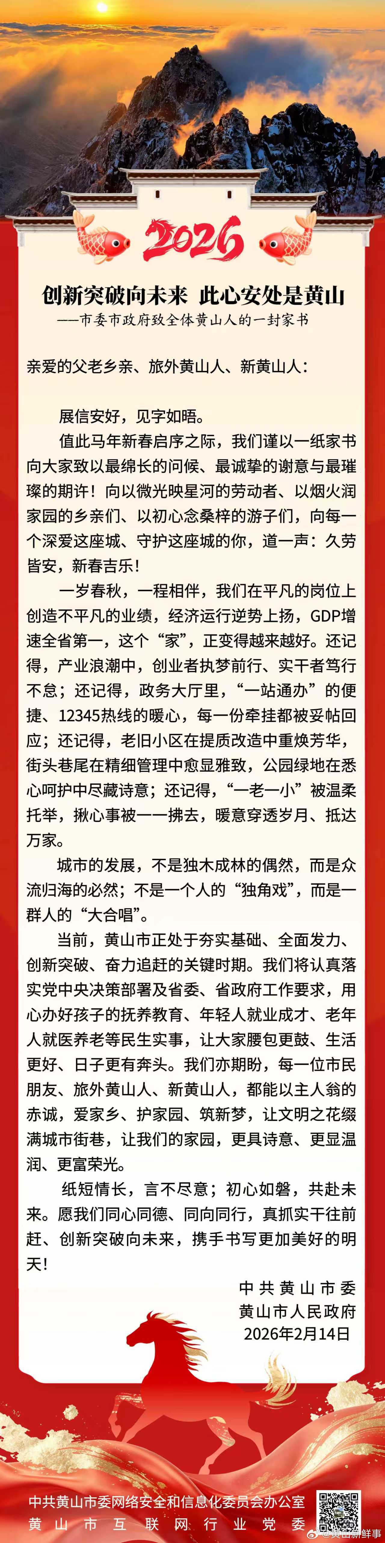 【致全体黄山人的一封家书】黄山市委市政府致全体黄山人的一封家书。2026家乡年