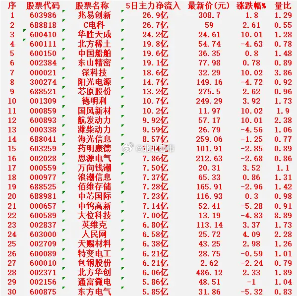 兆易创新:5日净流入 26.9亿元,量比 1.29C电科:5日净流入 26.7亿元,量比 0.55华胜天成:5日净流入 24.2亿元,量比 1.28北方稀土:5日净流入 19.8亿元,量比 0.78中国船舶:5日净流入 19.6亿元,量比 1.48东山精密:5日净流入 19.1亿元,量比 0.89深科技:5日净流入 18.6亿元,量比 3.86阳光电源:5日净流入 14.7亿元,量比 0.92芯原股份:5日净流入 13.2亿元,量比 0.96德明利:5日净流入 10.7亿元,量比 1.73