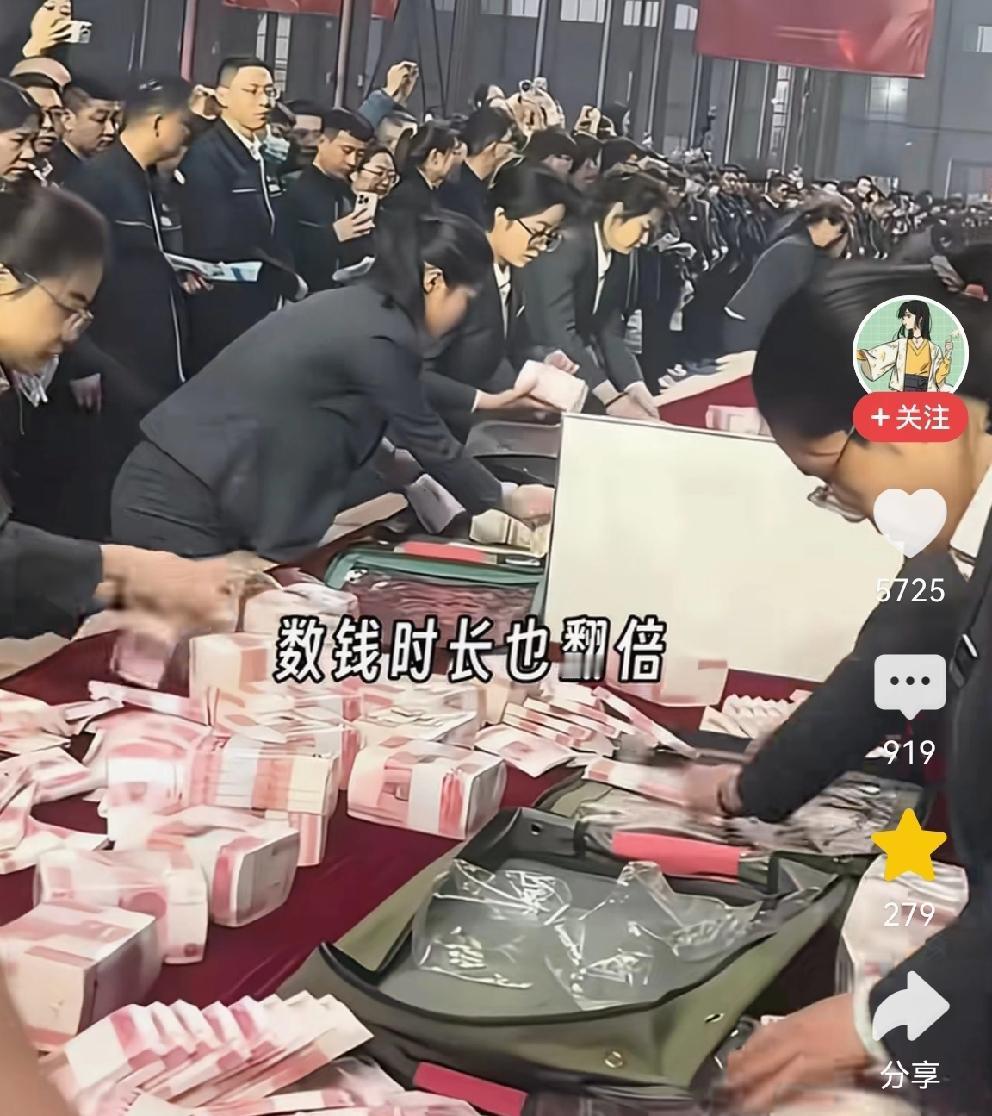 “钱打到卡上,冷冰冰的”, 年关将近,崔老板又高调给职工发钱了。 这场面真是壮观: 财务人员一箱箱搬来现金,一字儿摆在餐桌上,一百米长的桌子上摆满了百元大钞,职工们排着长队领钱。 最搞怪的是崔老板,拿着矿泉水瓶子和纸巾,给数钱的人润润手指! 最燃的场面是,当老板发现给劳模发奖是一台洗衣机,当时不高兴,走上台喊,财务主管“郭玉梅”,每人发2万。 这老板太爱发钱了:发年终奖特高调,大手笔;国庆节中秋节也发钱;不仅给职工发,还组织职工的父母去旅行。 看着这发年终奖的热闹场面,特别是看着这“嘎嘎响”的百元大钞,真的是羡慕啊! 网友说:我怎么没有遇到这样的好老板! 是呀,我也想说,我怎么没有遇到这样的好老板! 为崔老板点赞👍