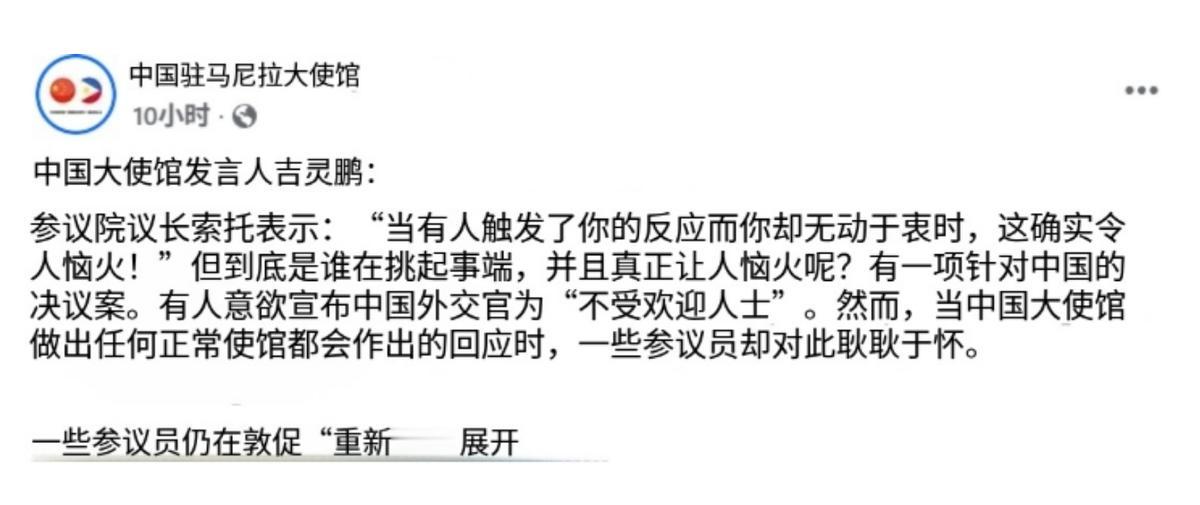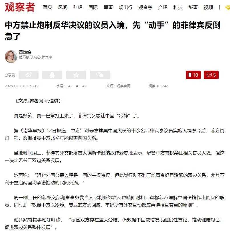 中方禁止炮制反华决议的议员入境,先“动手”的菲律宾反倒急了。 据《南华早报》2月12日报道,中方这次不让入境的,是十多名菲律宾参议员,他们干的事太过分了——专门弄一些针对中国、说中国坏话的文件。 还恶意抹黑中国驻菲律宾大使,甚至想把中国外交官列为“不受欢迎的人”,不让我们的外交官正常工作。 这些参议员不好好管自己国家的事,天天没事找事,专门挑中国的不是,故意挑拨两国关系。 更可气的是,菲律宾一个小镇才400多人,也跟着瞎起哄,把中国大使列为“不受欢迎的人”,纯粹是没事找事。面对这种挑衅,中方肯定不能忍,所以才禁止这些挑事的官员来中国。 这里跟大家说清楚,中方这么做,一点问题都没有。每个国家都有权利决定,谁能来、谁不能来,这是国家的权利,菲律宾自己也承认这一点。 再说了,你对我不好,我也不会对你客气,他们能抹黑我们、不欢迎我们的人,我们自然也能不欢迎他们,这就是公平合理的回应。 可没想到,中方刚出手反击,菲律宾就立马急眼了,态度特别可笑。当地时间周三,菲律宾外交部发言人出来说话,嘴上承认中方有权利不让人入境,转头就说我们的决定影响两国关系,不利于民间交流。 紧接着,另一个刚上任的发言人也跟着附和,让中方“冷静一点”“专业一点”,要相互尊重。 这话听着就来气,当初他们的参议员抹黑我们、挑衅我们的时候,怎么不想着相互尊重?怎么不冷静一点?现在我们只是反击了一下,他们就受不了了,这不是双重标准是什么? 其实大家也能看出来,他们不是真的关心中菲关系,就是怕吃亏、怕我们进一步反击,更怕失去和中国合作的好处。 菲律宾内部也不是一条心,那些挑事的参议员,只是想靠反华博眼球、捞好处,而菲律宾政府心里很清楚,不能真的把中方惹急了。 而且菲律宾离不开和中国的合作,这几年两国合作,给菲律宾带来了很多好处,也让他们很多人有了工作,他们怕我们停止合作,断了他们的好处。 更可笑的是,菲律宾一边急着让我们冷静、缓和关系,一边还在背地里讨好美国,加强和美国的军事合作,想两头占便宜。现在中方反击了,他们怕两边都落空,所以才急得跳脚。 中方的态度一直很明确,我们不想惹事,但也不怕事。我们愿意和菲律宾好好相处,妥善处理分歧,但绝对不能容忍任何人抹黑中国、挑衅中国。 希望菲律宾能认清现实,管好自己的人,停止小动作,拿出诚意和我们好好谈,这才是对两国人民都有利的事。 说到底,这事就是菲律宾先挑事,被反击后又急眼,纯属自找的,实在太可笑了。