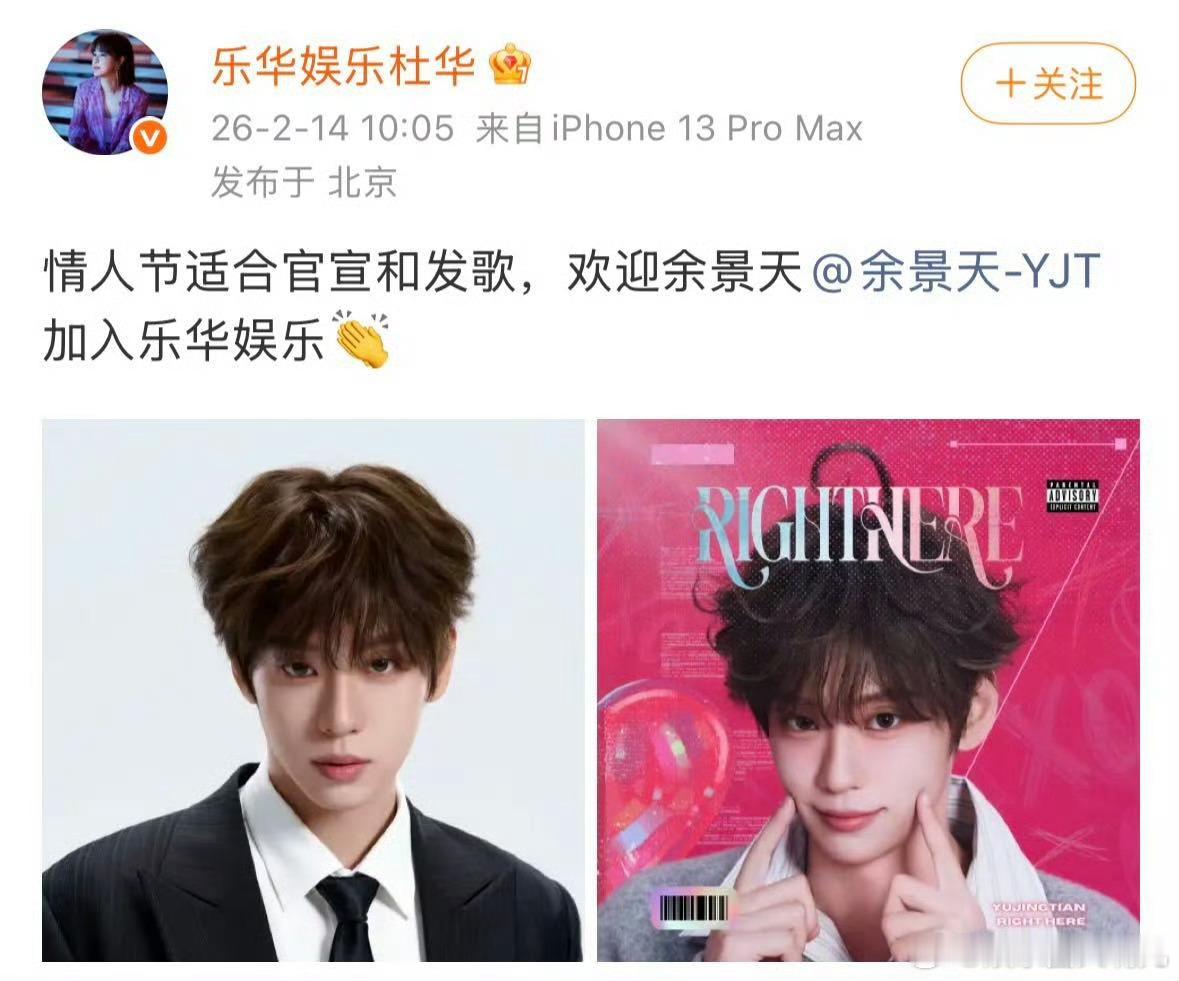 余景天官宣加入乐华后首支单曲 情人节当天,余景天给了粉丝一个双向奔赴的礼物——新公司官宣➕新歌上线。《Right Here》听起来轻松又甜蜜,副歌一遍就会哼。杜华亲自发博站台,接下来这条路,应该会走得更稳了。