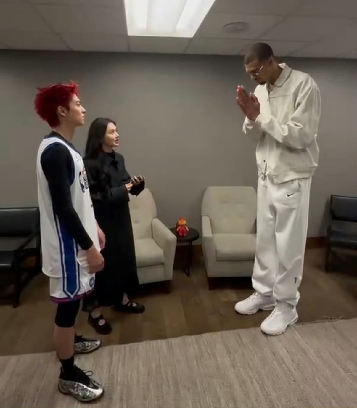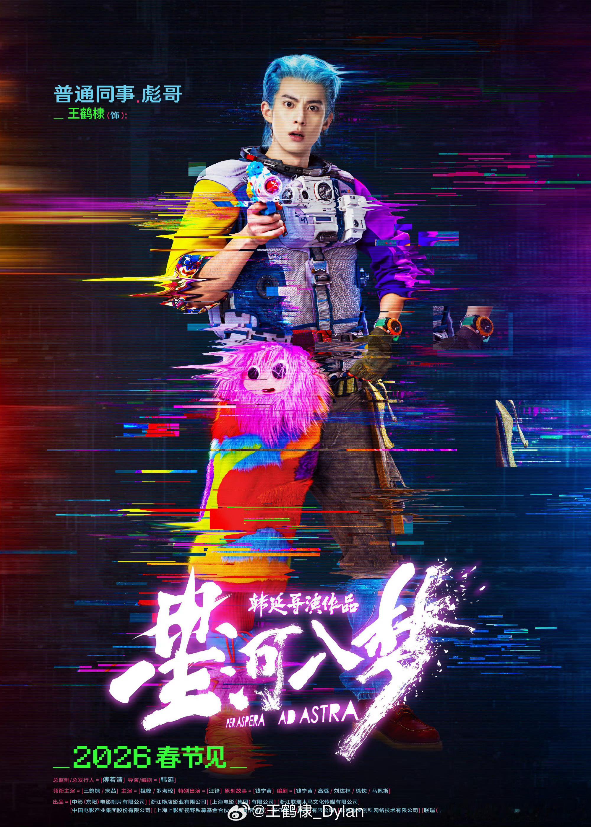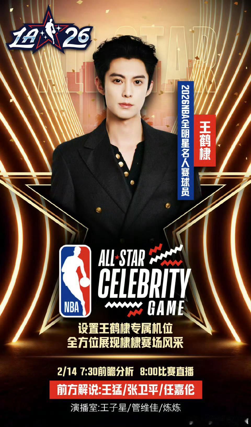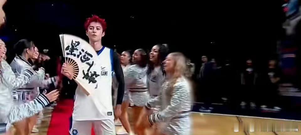 王鹤棣在NBA宣传星河入梦 王鹤棣这波NBA名人赛真的赢麻了,红发樱木花棣既视感,手拿星河入梦扇子宣传电影,还和Cortis拍了合照,大年初一必须支持。