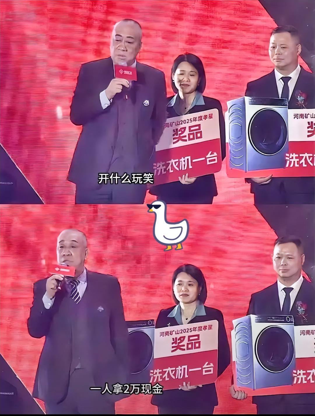 别的老板开年会都在精打细算省钱 河南矿山这位崔培军老板 却在年会现场直接发飙 嫌奖品太寒酸! 台上摆着洗衣机等奖品,崔总当场黑脸,直接质问采购:这东西能值几个钱? 原来往年年会都是直接发金项链,今年因为金价上涨太多没能安排,换成家电后他依旧不满意。 下一秒全场沸腾!崔总大手一挥,当场决定:每人再补发20000元现金! 这一幕直接看懵在场所有人,也让无数打工人羡慕不已。 对比不少公司发个小礼品都要反复宣传,差距实在太明显。 很多人觉得网上的好老板都是剧本,但真金白银摆在眼前,谁看了不佩服? 真正用心的老板,从来都是把员工当家人,而不是当成简单的劳动力。 两万块现金到手,可比任何家电都实在,这样实在又霸气的老板,活该生意红火!崔培军 起重集团崔老板 崔老板 河南矿山宴会