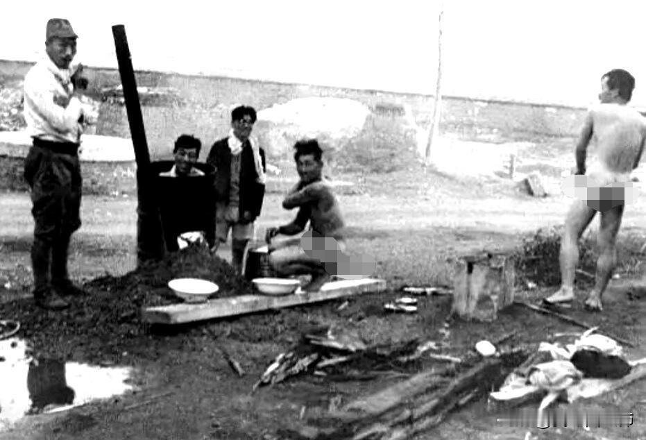 1937年,侵华战争期间,几名日本士兵正在露天洗澡。周围的环境有些杂乱,看起来,应该是刚刚结束战斗不久。他们把油桶改造成了洗澡盆,下面架起柴火,一边煮,一边洗。几个日本士兵站在一旁,跟他们闲聊着。难道他们不觉得尴尬吗? 那时,日本士兵们十分喜欢泡澡。他们把这视为保持身体干净,放松精神的重要方式。同时,还可以用此来维持士气和战斗力。 不过,如此简陋的泡澡方式,也看出日军的后勤保障,完全没能跟得上啊?