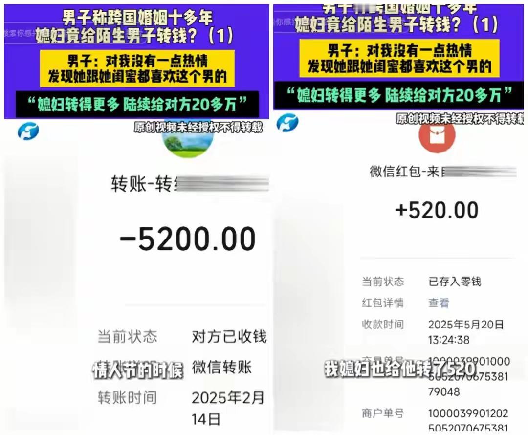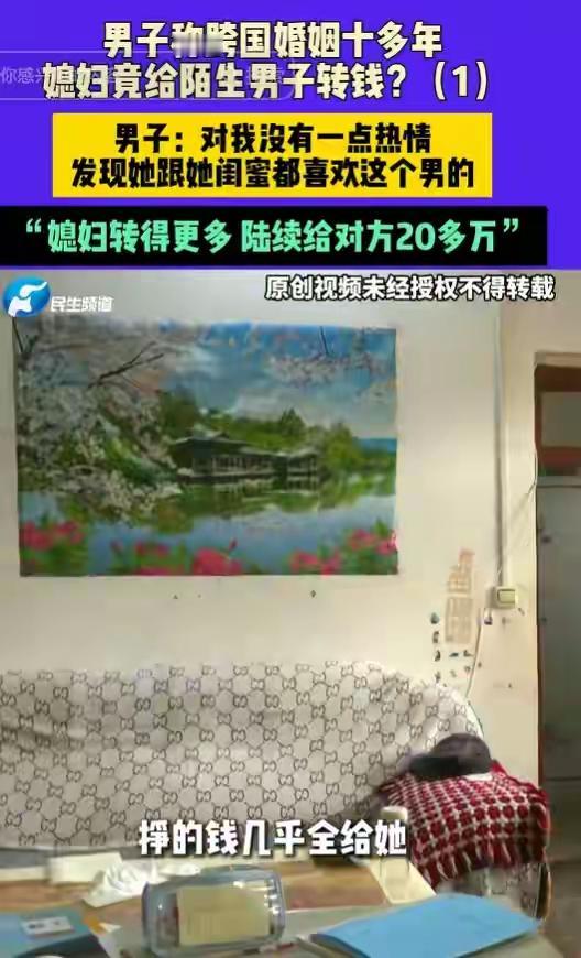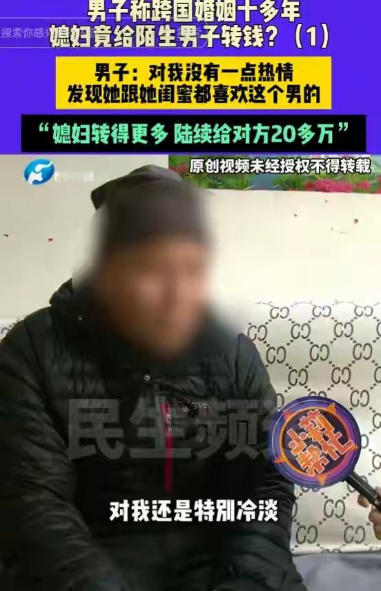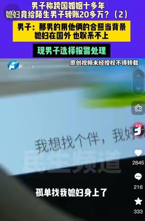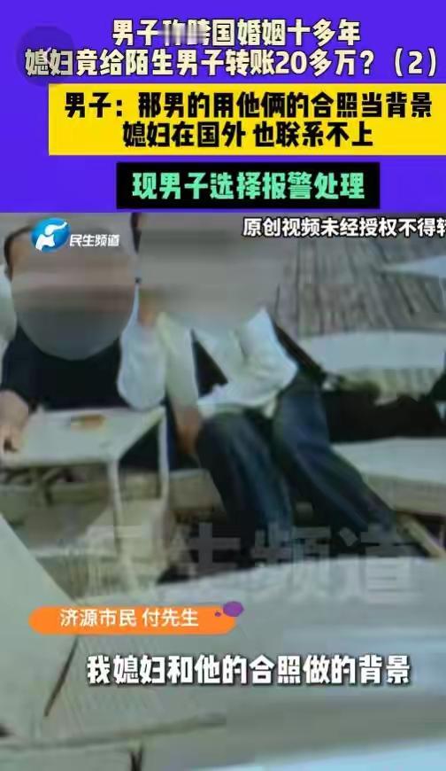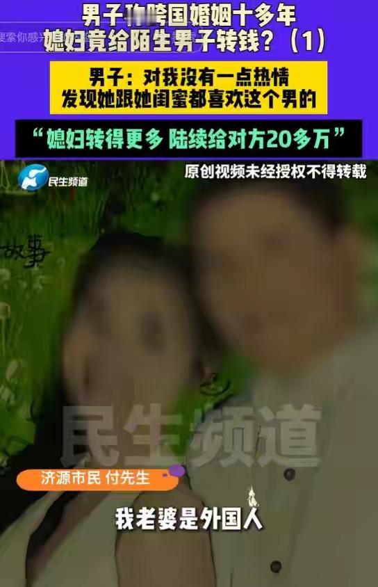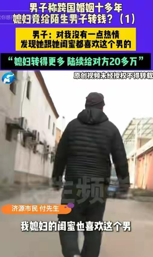 河南济源男子十年跨国婚姻梦碎:外籍妻子失联卷走20万血汗钱,情人竟用亲密合照当头像挑衅! 打工一年满怀期待回家团圆,推开门却只剩冰冷空气。河南济源的付先生怎么也没想到,结婚十余年的外籍妻子竟突然失联,连同消失的还有他半辈子攒下的二十多万元血汗钱。登录妻子微信那一刻,他如坠冰窟。 转账记录刺痛双眼,特殊日子的5200、520红包赫然在目,全部流向一个陌生男子。更扎心的是,那男人的朋友圈背景,竟是与自己妻子的亲密合照。那句“我想找个伴,我好孤单”的签名,像一把刀扎进付先生心里。 十年夫妻,育有两女,曾经的感情难道全是虚假?付先生回忆,变故始于2024年妻子独自外出打工。归来后温情不再,冷漠以对,就连生日红包也换不回一个笑脸。她整夜不归,最终以回娘家为由,一去无踪。 细查之下,更多细节浮出水面。妻子闺蜜竟也卷入其中,同样给该男子转账数万,最终在讨债无果的愤懑中突发心梗离世。这场情感与金钱的纠葛,早已埋下悲剧的种子。 面对质问,妻子曾反问“男女不能做朋友吗”?而那位“朋友”在电话里直接否认认识付先生。一切线索骤然断裂,只剩冰冷的转账记录和那张刺眼的合照,无声诉说着背叛。 当地村委已介入协调,但付先生的心早已漂泊无依。半生积蓄成空,妻子远在异国失联,两个女儿的未来笼罩阴云。他选择报警,试图抓住最后一丝希望,追回那份属于家庭的温暖与保障。 这场跨国婚姻的悲剧,撕开了信任与欲望交织的复杂人性。它提醒我们,无论地域国籍,婚姻都需要用心经营与守护。付先生的遭遇令人唏嘘,更让我们深思:在追求爱情与物质的路上,什么才是真正不可丢失的底线? (来源:小莉帮忙、济南日报·爱济南综合报道) 跨国婚姻危机 情感骗局