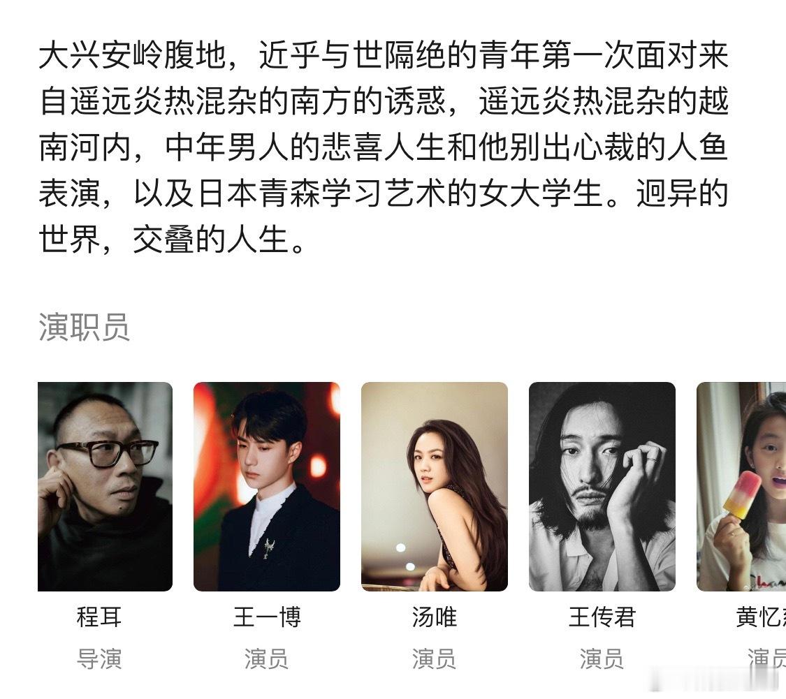 程耳电影《人鱼》豆瓣更新演职表:王一博、汤唯、王传君,期待这部影片早日上映