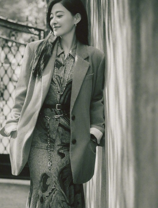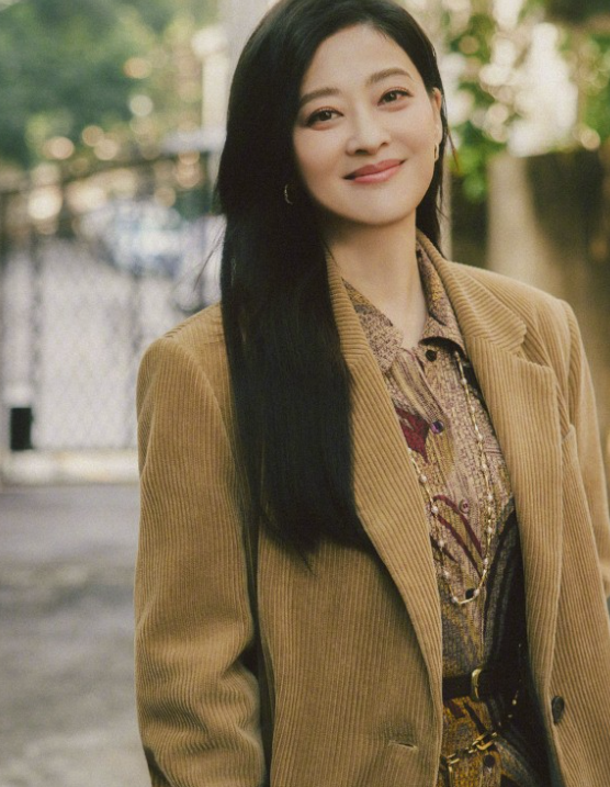 梅婷最新照片 卡其色灯芯绒西装叠搭印花长裙,复古又松弛。黑靴与金链点缀,在老巷的光影里,梅婷的温柔与气场,都藏在这一身恰到好处的质感里