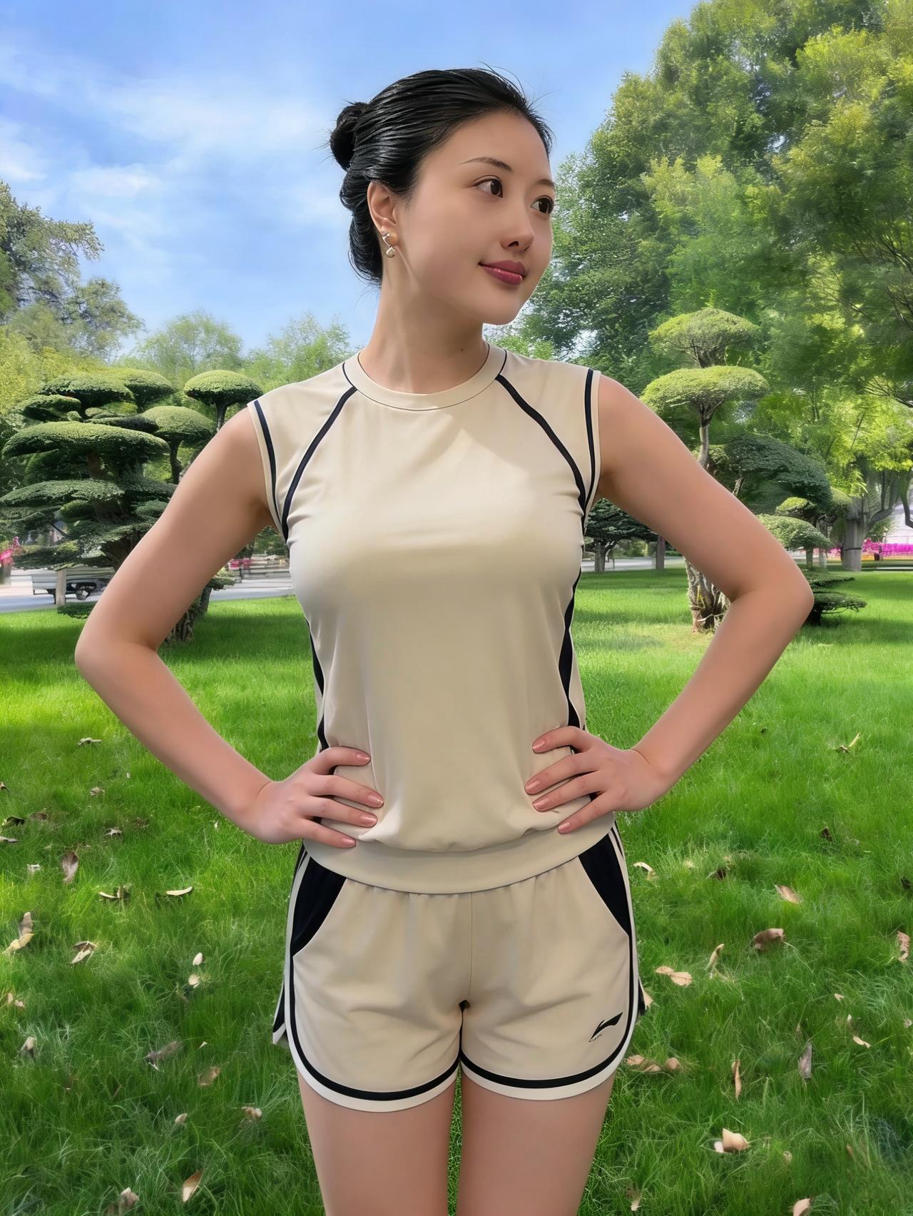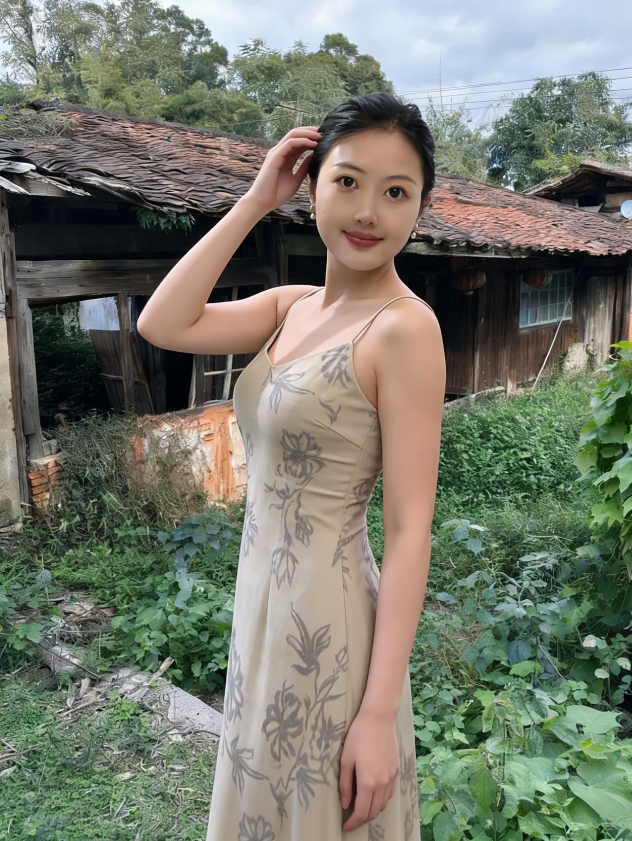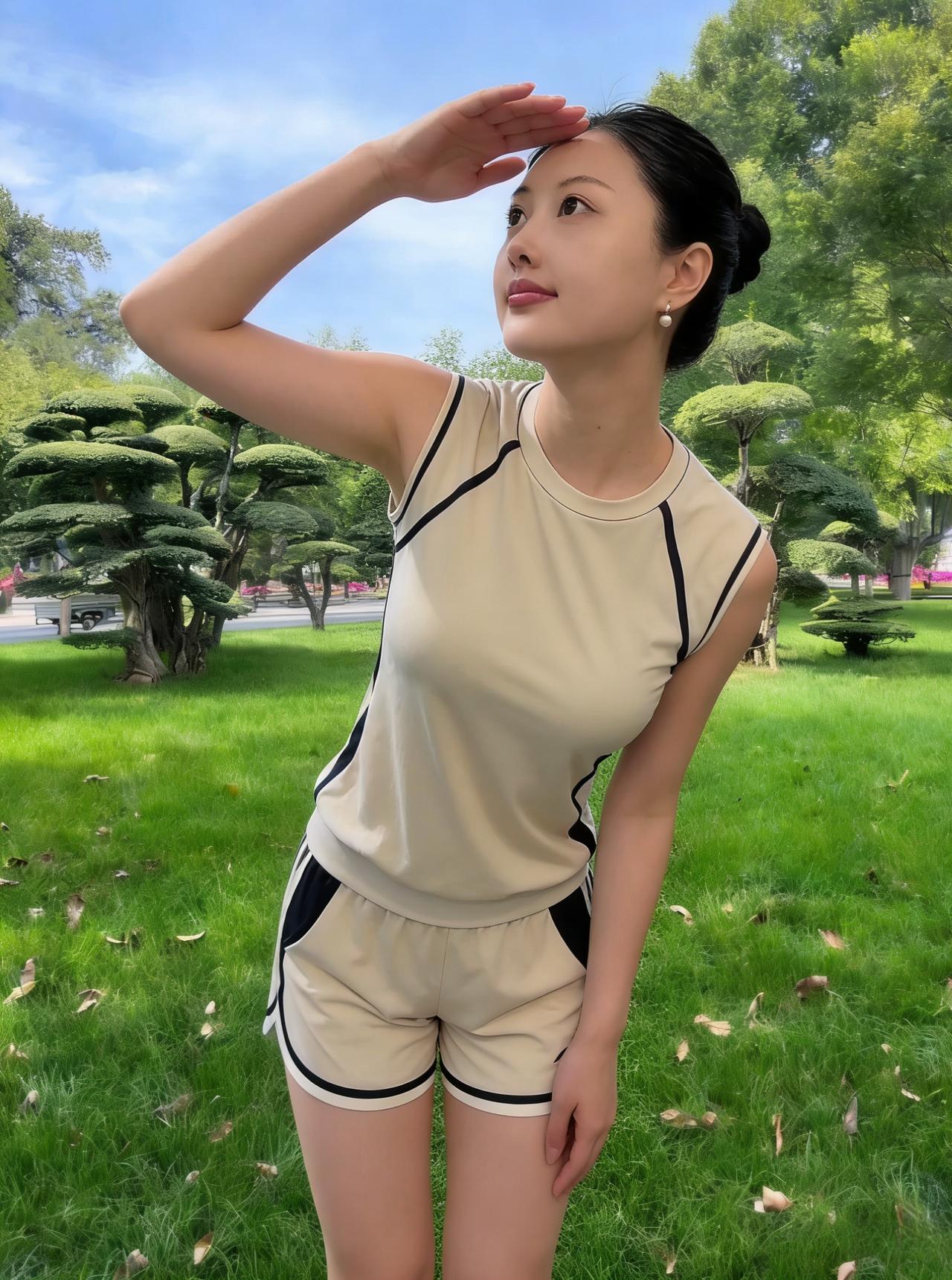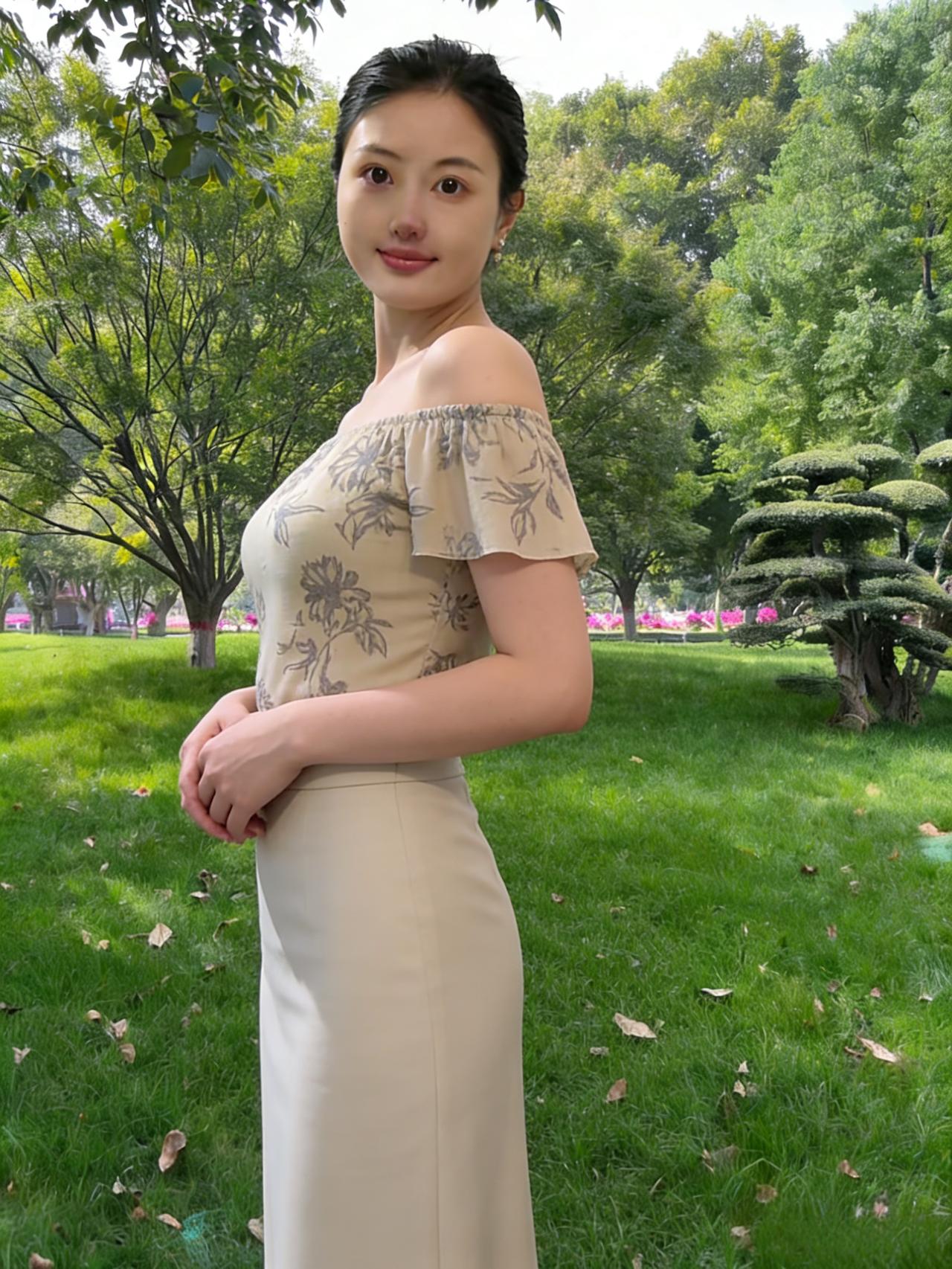 芳园凝翠色,佳人立绿荫。 露肩裁锦袖,曳地翦罗襟。 花衫描叶影,素裙映竹阴。 眉弯涵秀气,目澈湛天心。 风轻摇细柳,云静抱遥岑。 石盆藏古木,庭草结芳林。 幽思随蝶舞,闲情逐鸟吟。 独立春光里,悠然忘俗尘。
