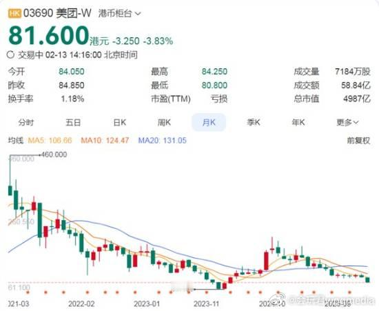 美团市值跌破5000亿 2026已跌超20%2月13日消息,美团港股今日开盘延续近期跌势,截至本文发稿,股价报81.6港元/股,总市值4987亿港元,正式跌破5000亿港元关口。2026年开年至今不到两个月,美团股价已大跌超20%。对比2025年初股价尚在百港元之上、市值超6000亿港元的水平,短短一年半时间,其市值已蒸发逾1200亿港元。据了解,美团市值持续缩水,既受港股互联网板块整体低迷影响,也有明确利空触发。2月10日,国际评级机构穆迪将美团展望由“稳定”调整为“负面”,核心担忧在于外卖业务在激烈竞争下的复苏能力。行业分析指出,市场焦虑集中显现:美团依靠补贴换增长的模式失效,价格战持续挤压利润率,高杠杆周期或长于预期。数据显示,2025年前三季度美团总收入同比增速降至12%,远低于此前20%以上的增幅;调整后EBITDA利润率从2024年的13%降至2%,外卖业务自2025年二季度起已陷入亏损。竞争层面,美团面临来自阿里的强力冲击。阿里核心管理层年初在内部会议表示,将大力推进淘宝闪购,三年内不设亏损压力,2026年投入力度将进一步加大,目标年内市场份额超越美团。阿里未来三年在闪购生活服务领域不计盈利的持续投入,让美团面临巨大竞争压力。此外,美团生活服务业务成长空间有限,AI布局暂未体现出足够商业想象力,旗下龙猫大模型、生活服务助手小美等尚未打开新的市值增长空间,也制约了股价回升。值得关注的是,尽管南向资金已连续3日净买入美团,累计净买入16.93亿港元,但期间股价仍下跌6.81%,资金抄底未能扭转跌势。证券时报·数据宝统计显示,2月12日港股通(包括沪市港股通及深市港股通)成交活跃股合计成交362.21亿港元,净买入金额为26.53亿港元。2月12日上榜的成交活跃股中,美团通过港股通渠道成交金额为38.31亿港元,净买入金额为9.85亿港元。不仅如此,该股已连续3日出现成交净买入,累计净买入金额为16.93亿港元,其间股价下跌6.81%,资金与股价走势持续背离。