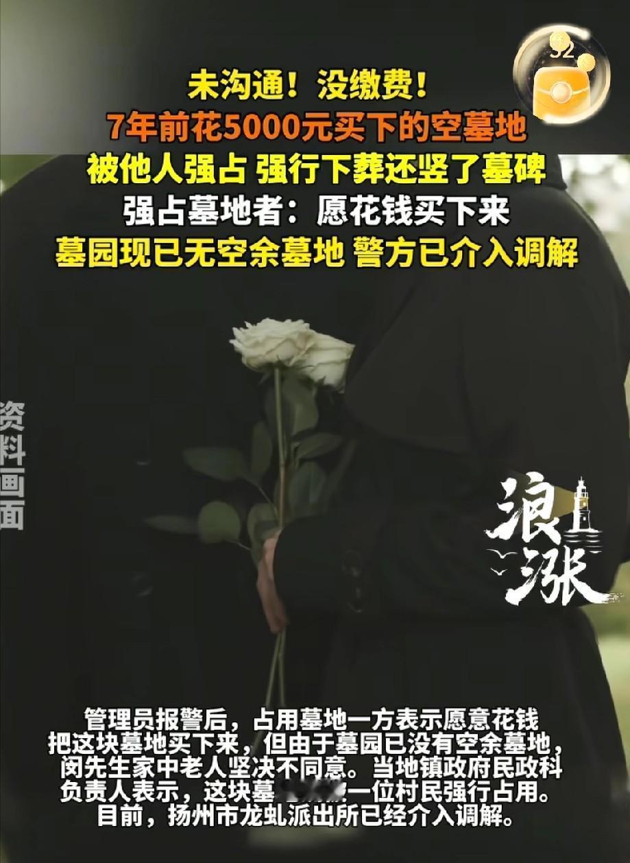 江苏扬州一位八旬老人,七年前曾选定一处墓地,家人花费五千元购置,只为让老人安心。近期家属却发现,该墓地已被他人占用并立碑。墓园称曾劝阻附近村民无果,占用者还提出愿出钱买下,老人对此难以接受。 这里是扬州的一角,镜头不要对准那些冰冷的办公桌,请移向墓园边缘那一小片特有的竹林。正午的阳光穿过叶片,斑驳地洒在泥土上,这是整个园区光照最好的位置。 时间回拨到七年前,也就是2019年。两位80岁的老人曾在这里久久驻足,他们用脚步丈量了土地,指着这块伴着竹林声响的空地说:“就这儿吧。”对于风烛残年的老人来说,这不仅仅是一块地,这是他们为自己选定的、通往另一个世界的“户口”。 女婿闵先生是个痛快人,看着岳父母满眼的踏实,二话没说掏出5000块钱,当场签了协议,锁定了这份“身后契约”。那张薄薄的纸片,在全家人眼里分量极重,大家像守护最珍贵的家当一样,把它仔细收好,小心翼翼地放进抽屉深处珍藏起来。 谁能想到,这张在此后2000多个日夜里支撑着老人心理安全感的纸,在暴力的现实面前,竟然脆得像一片枯叶。 就在这个月,当闵先生一家再次踏入这片竹林时,原本留白的空地上,赫然竖起了一块崭新的墓碑。碑上刻着一个完全陌生的名字,水泥封得严严实实,甚至连祭拜过的香灰都还热着。 那一瞬间,闵先生脑子里嗡的一声。这算什么?这是明目张胆的入室抢劫,只不过抢的不是金银细软,而是死后的安宁。 一家人冲进管理处讨说法,得到的答案却让人背脊发凉。管理员并没有推脱责任,而是两手一摊,抛出了一个更荒诞的事实:“我们也拦了,但根本拦不住。” 原来,就在下葬那天,这块地既没有缴费记录,也没有变更手续。对方直接带着一帮壮汉冲进了园区。面对管理员的阻拦,这群人没有丝毫犹豫,推搡、叫骂,甚至差点动起手来。 在这帮人的逻辑里,没有什么先来后到,也没有什么法律契约。他们依仗的只有一条原始法则:把人埋进去,造成既成事实,你就拿我没办法。这是一场精心计算过的“零成本掠夺”。 更让人窒息的还在后面。当警方介入,这帮侵占者坐在谈判桌对面时,态度嚣张得令人咋舌。他们轻描淡写地抛出一句:“行了,大不了我出钱把这块地买下来。” 听听这话,多么熟悉的强盗逻辑。先上车后补票,把恶意的侵占美化成一笔迟到的交易。他们赌的就是中国传统文化里“死者为大”的软肋,赌你不敢掘墓,赌你只能捏着鼻子认栽。 但这次,他们撞上了铁板。这不是钱的问题,是“有钱无地”的死局。 墓园方翻开了底账,摊在桌面上:整个园区早就没有空余墓地了。这是一种绝对不可再生的稀缺资源。对闵先生年届八旬的岳父母而言,那块临着竹林、向阳避风的安息之地,在七年的反复念叨与期盼里,早已成了他们心中安稳踏实的归宿。 你让两个八旬老人怎么接受?告诉他们,你们看了七年的家被人强占了,现在给你们一笔钱,你们随便找个凉快地方呆着去?这无疑是精神上的谋杀。老两口自从知道消息后,寝食难安,原本平静的晚年瞬间崩塌。 现在的局面异常尴尬。一边是《民法典》里白纸黑字的条款——私有财产神圣不可侵犯,理论上必须“恢复原状”,也就是强制迁坟。另一边却是基层执法的泥潭——派出所正在进行一轮又一轮的调解。 调解?这事儿有什么好调解的? 如果是你的房子被流氓强占了,警察会劝你把房子卖给流氓吗?显然不会。但一旦涉及“墓地”和“死人”,法治的刚性往往就会变得暧昧不清。 闵先生一家的愤怒正在于此。他们手里握着合法的合同,交了真金白银,守了七年的规矩,最后却要为一个破坏规则的无赖让步?如果“强行下葬+事后赔钱”成了通行规则,那这个社会的契约精神就被彻底埋葬了。 直到现在,那块刻错名字的墓碑依然立在竹林边,像一个巨大的惊叹号,嘲讽着所谓的规则与秩序。这场博弈,守住的不仅是一块地,更是法治社会不向野蛮低头的底线。 参考信息:未沟通!没缴费!7年前买的空墓地被他人强占2026-02-13 17:11·看看新闻