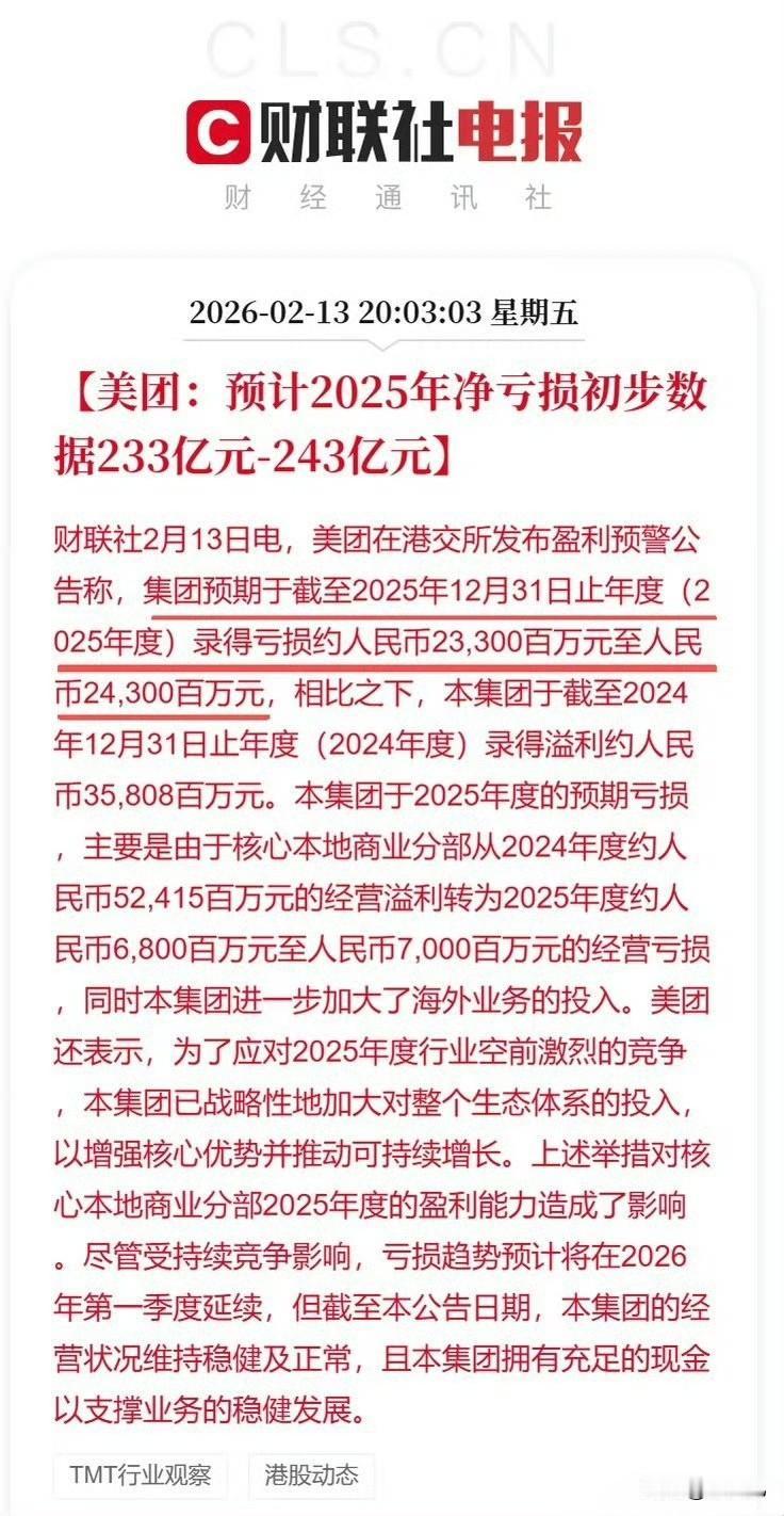 美团发了年报,2025年亏损233~243亿元,上年同期溢利358亿元,意味着烧掉了接近600亿人民币,股价从200多跌到80多,市值一度跌破5000亿,这就是被卷进「外卖大战」的代价,阿里太不讲武德了。 让我百思不得其解的是:商家利润下降,骑手没挣着钱,客户钱没少花,最后平台还赔钱,钱去哪儿了?