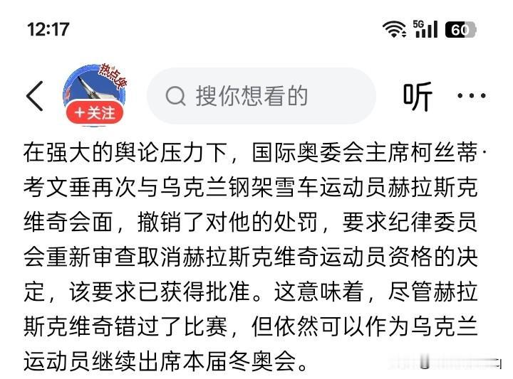 民意? 乌克兰钢架雪车运动员赫拉斯克维奇 ,因为佩戴头盔嵌有纪念在乌克兰战争中,因与父亲一起进行训练的乌克兰舞蹈冠军达莉娅·库尔德利,好像被俄罗斯的火箭炮击中,造成重伤,虽经全力救治,终因受伤非常严重,后来不治身亡的遗像,而被禁赛。 赫拉斯克维奇在头盔上嵌上了达莉娅的遗照,进行参加冬季奥运会比赛之前的训练,但被国际奥委会禁止。然而,赫拉斯克维奇依然固我,仍然是戴着那个特制的、嵌有达莉娅遗像的头盔进行赛前训练。结果,被国际奥委会禁止参加比赛。与此同时,乌克兰立即行动,在2月12日援予赫拉斯克维奇冬季奥运会自由勋章。 然而,在舆论、以及乌克兰和西方国家的强大压力下,国际奥委会主席柯丝蒂·考文垂似乎不得不再次会见赫拉斯克维奇,并宣布撤销对他的处罚,并且要求囯际奥委会纪律委员重新审查取消赫拉斯克维奇奥运会的参赛资格,而且好像已经得到批准。 不知道为什么,戴一个嵌有被战争摧毁的冠军运动员的遗像,与奥运会参赛资格有什么关系?