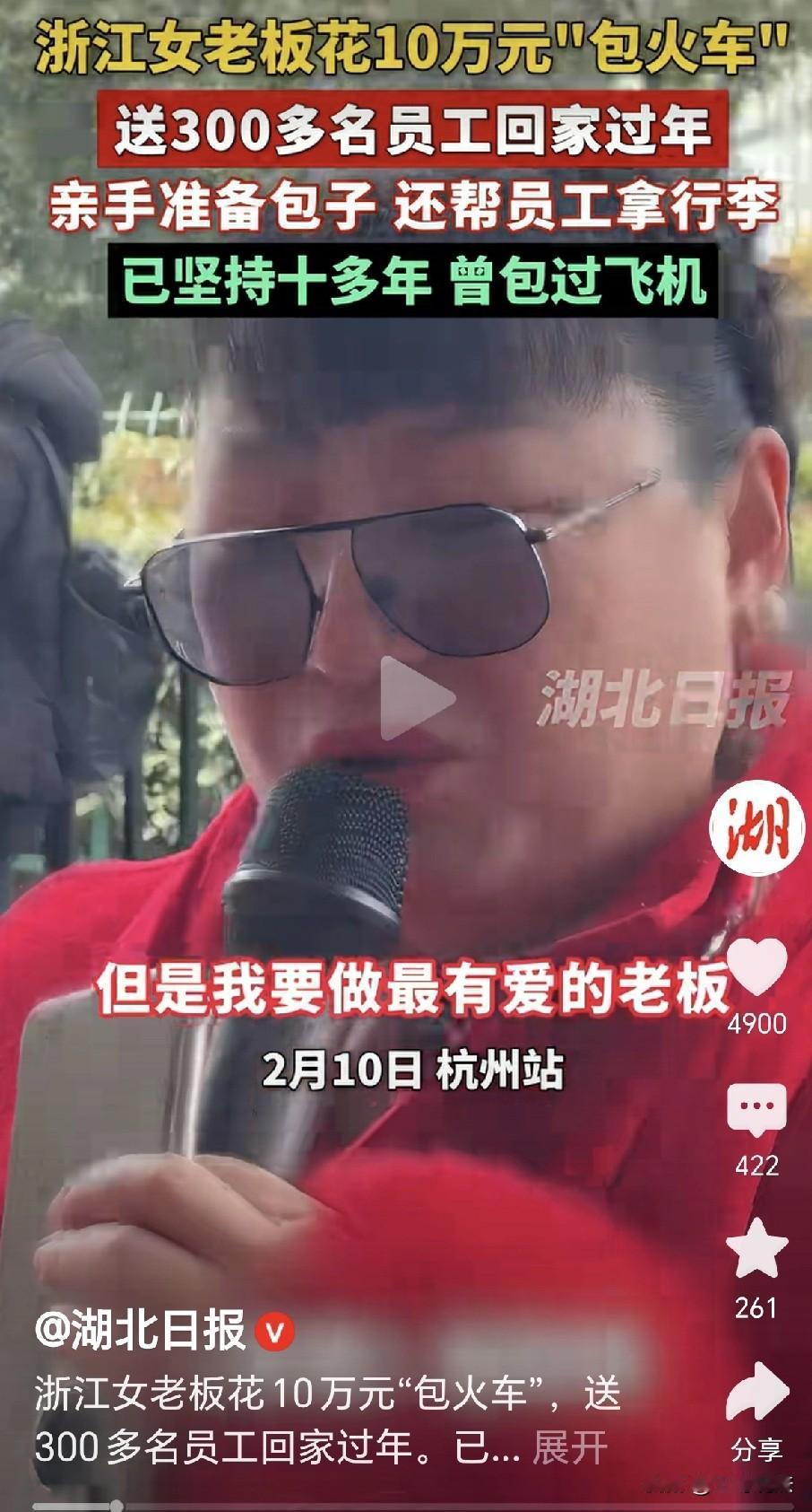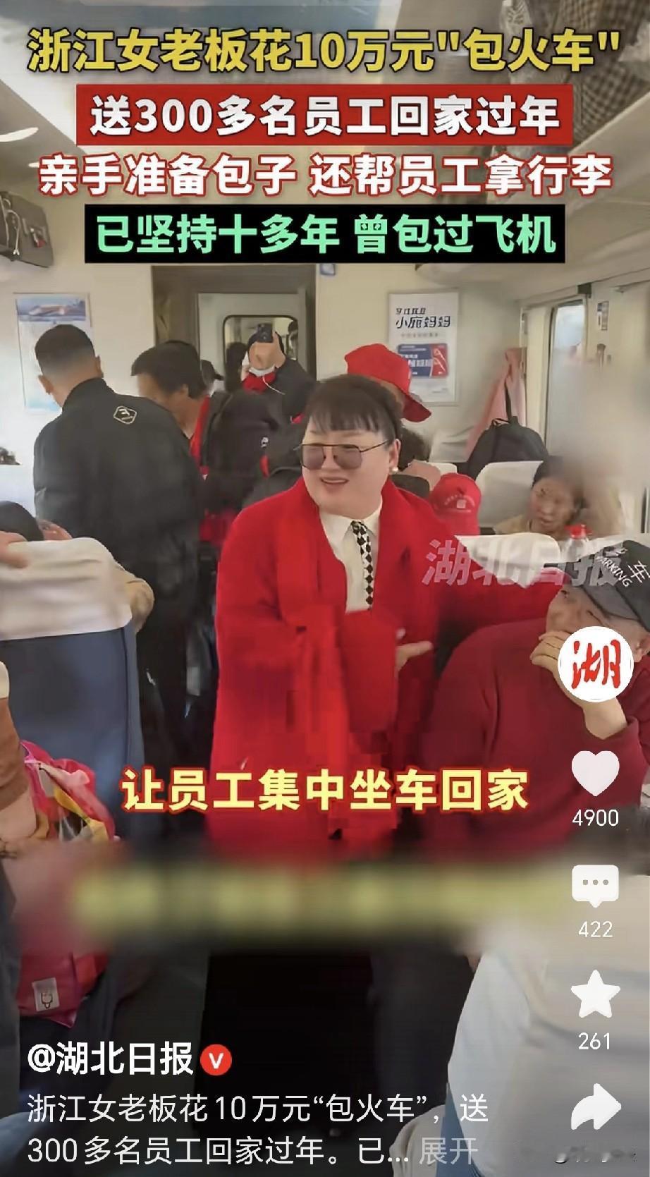 人间有大爱!浙江杭州,一女子创业20年,自己开了公司,员工最多时高达上万,大部分员工来自老家,女子深知买票之难,她花10万元包车箱送员工回家,最贵时花过20万,她包过火车,包过飞机,只为让员工回家吃团圆饭,她亲手包了酸菜猪肉包子,给老乡们带到路上吃,而她自母亲去世后,十几年都没回过家乡,女子忍不住落泪: 我不能让我的员工成为最有钱的人,但是我要做最有爱的老板! 眼看要过春节,王凤又和往年一样,她统计了员工,有300多名员工要回老家过年。 她联系了老家,在老家的协调下又包了一列车厢,让她的员工们集中坐上往老家赶。 她又提前亲手包了酸菜猪肉馅的大包子,给员工们一一装好,要他们带到路上吃。 员工们背着行李,行李里带着给家人的礼物,他们满眼的期待,拿着包子就进了车厢。 车厢里都是同事,他们忍不住热泪盈眶,他们年年回家,都能享受到这样的福利。 老板王凤是黑龙江人,她早年就到宁波打拼,经过她的努力,她事业有成,她自己办了公司,公司日益发展强大。 她的公司有很多员工,他们都是从老家出来,平时他们兢兢业业,辛苦奋斗,在公司完成了每一项的任务。 可是每到过年,他们就要发愁返乡的车票难买。 如果买不到票,回家就成了问题,家乡盼望的亲人,一年到头就见不上面。 王凤看到这样的场景,她回忆起早年自己回老家的场景,每到春节,火车票一票难求,很多人望而兴叹,不得不在外面过年。 她当年为了回家,想过各种的办法,有时能买到票,有时只能买到站票,更有的时候,连站票都没有,那种焦急艰难,至今都在脑海里没有散去。 王凤做了个大胆的决定,她决定以后公司包车厢送员工回家过年。 她这一包,就坚持了14年,公司最红火的时候有近万的员工在上班,为了让他们如期回家,她包过整列的火车,一次花了20多万。 再远一点的员工,她直接包下飞机送他们返乡,到了今年,有300多名员工要回家乡,她提前就和家乡协调好了车厢。 送别这天,恰逢到了小年,她唯恐员工们艰难,送别这天,她亲自到了车站。 她抬着几大箱的包子,那是她亲手包的酸菜猪肉包子,给老乡们带在路上,饿了时就当做干粮。 只见她带着喜庆的大红围脖,她依依不舍,不由自主的流下了眼泪。 她送老乡们回家,可是她自己也有家乡,但是自从母亲去世后,她有十几年再没有回去。 老家是一种乡愁,虽然家中母亲不在,可是那梦里的牵挂,永远都不会再有尽头。 员工们拎着包子,说说笑笑踏上专列,他们挥手道别,明年还会再一次相见。 王凤留在宁波的公司,她人随留下,心却早已飞回了家乡,老家的一切,常常在她梦中出现,家乡的一草一木,都让她深深的印在了脑海。 员工们和她一样,有家有业,有父母,有孩子,他们都在老家,再翘首期盼。 王凤表示,我不能让我的员工成为最有钱的人,但是我要做最有爱的老板! 有人觉得王凤太傻,不如直接发钱实在,可是你又怎知,人家没有给员工发奖金? 人家这是福利,员工们都懂,这趟专列载的不只是回家的路,更是王凤把他们当家人的心意。 不少老员工说,每年春运看到新闻里的抢票大战,立刻就会想起王凤包的专列,想起那热气腾腾的包子。 每年过年的时候,王凤坚守在公司,看着员工们发来的拜年视频,她笑意盎然。 员工们的笑脸,比啥都要珍贵,他们相隔千里,心在一起,王凤的心里全是暖意。 有网友立马就问,这公司在哪,我明年也要去! 更有人说,这样的老板真敞亮,2026年,祝福这位善良的老板娘,活该你生意兴隆!活该你发大财! 她完全没有必要这么做,但她做了,致敬每一位善良,仁爱,努力拼搏的老板,为你祝福,祝你永远幸福安康! 对此,你怎么看?