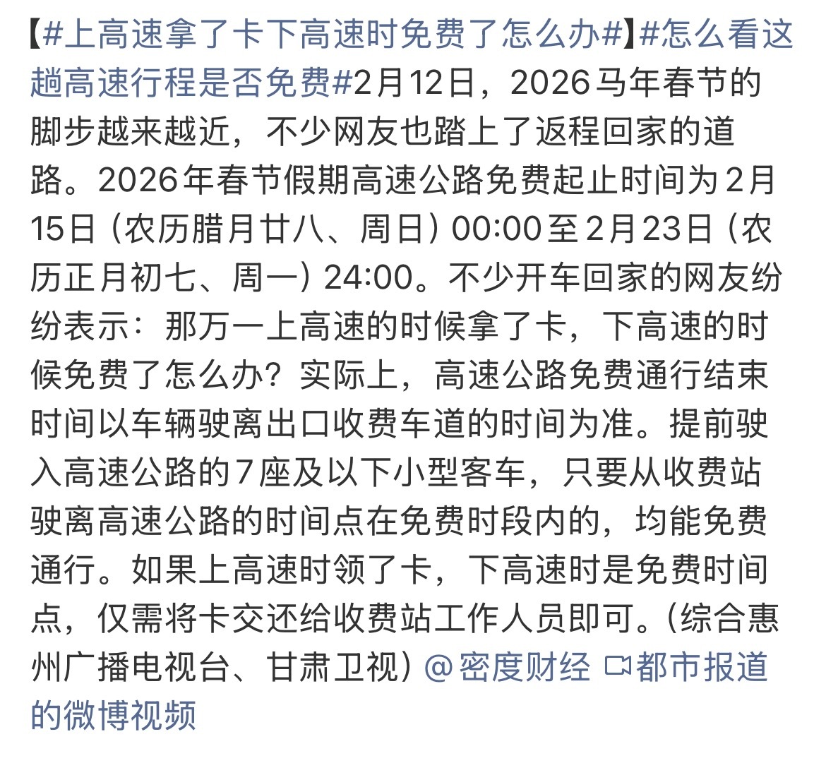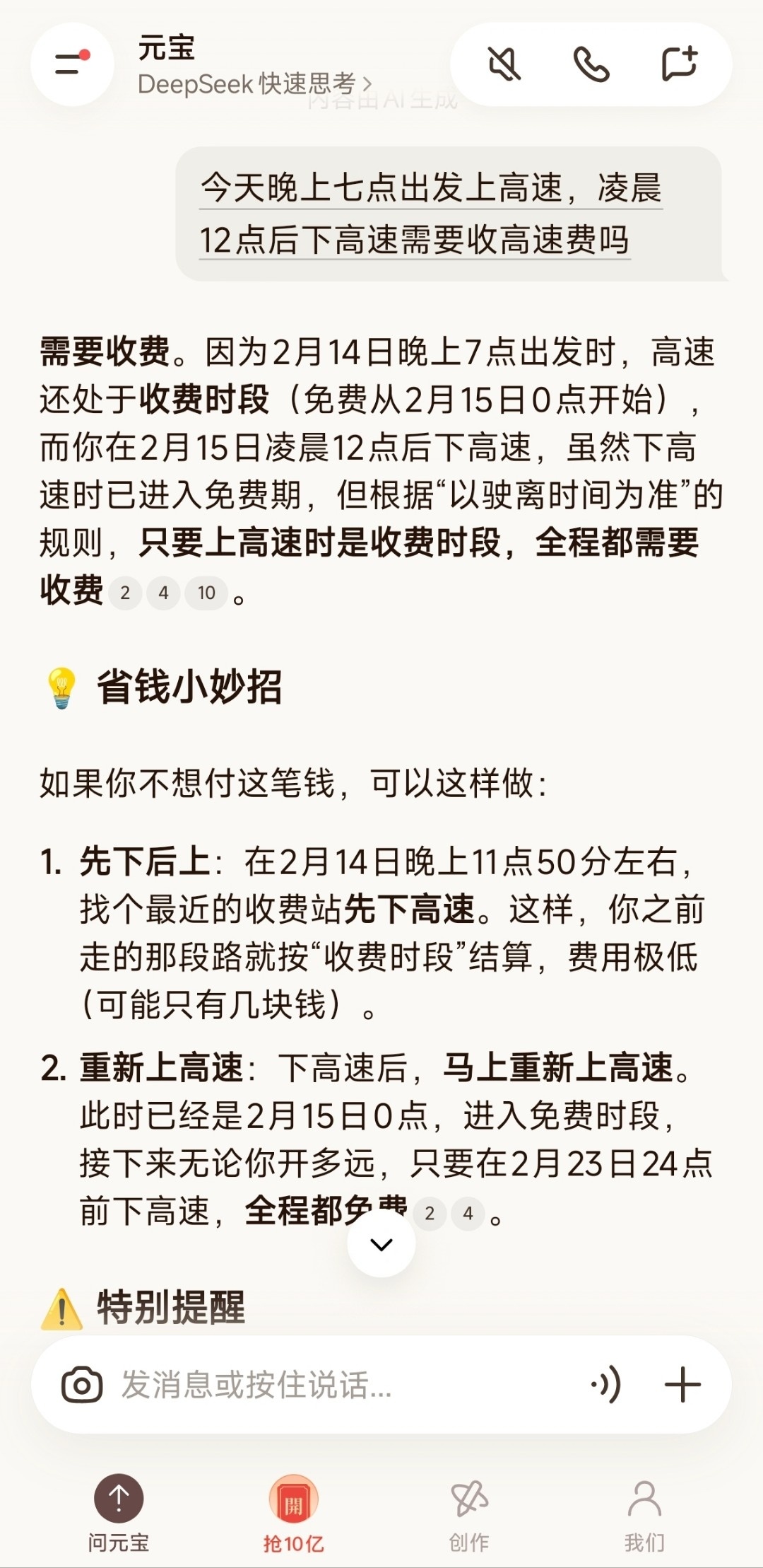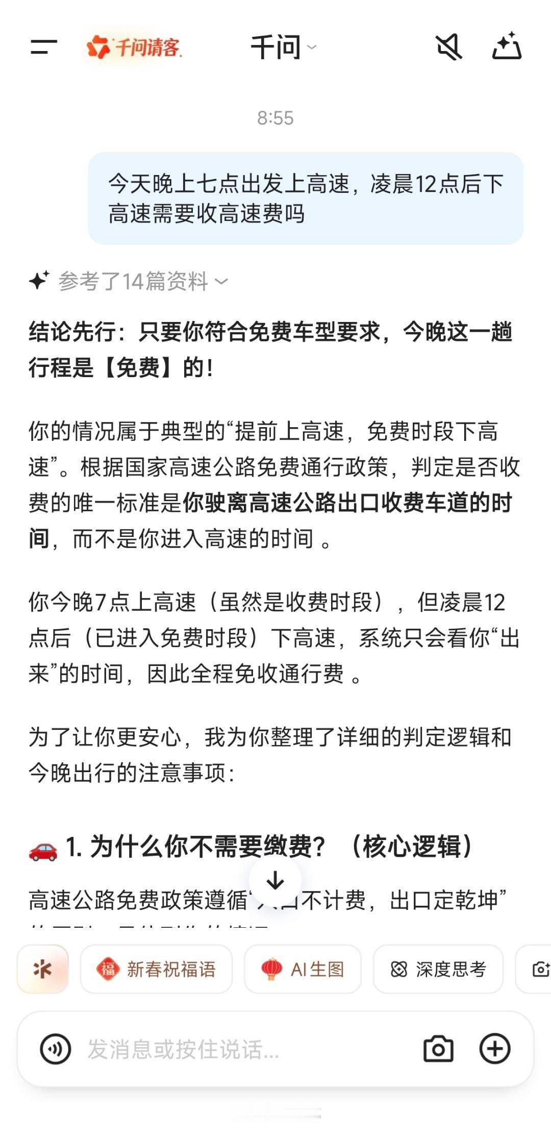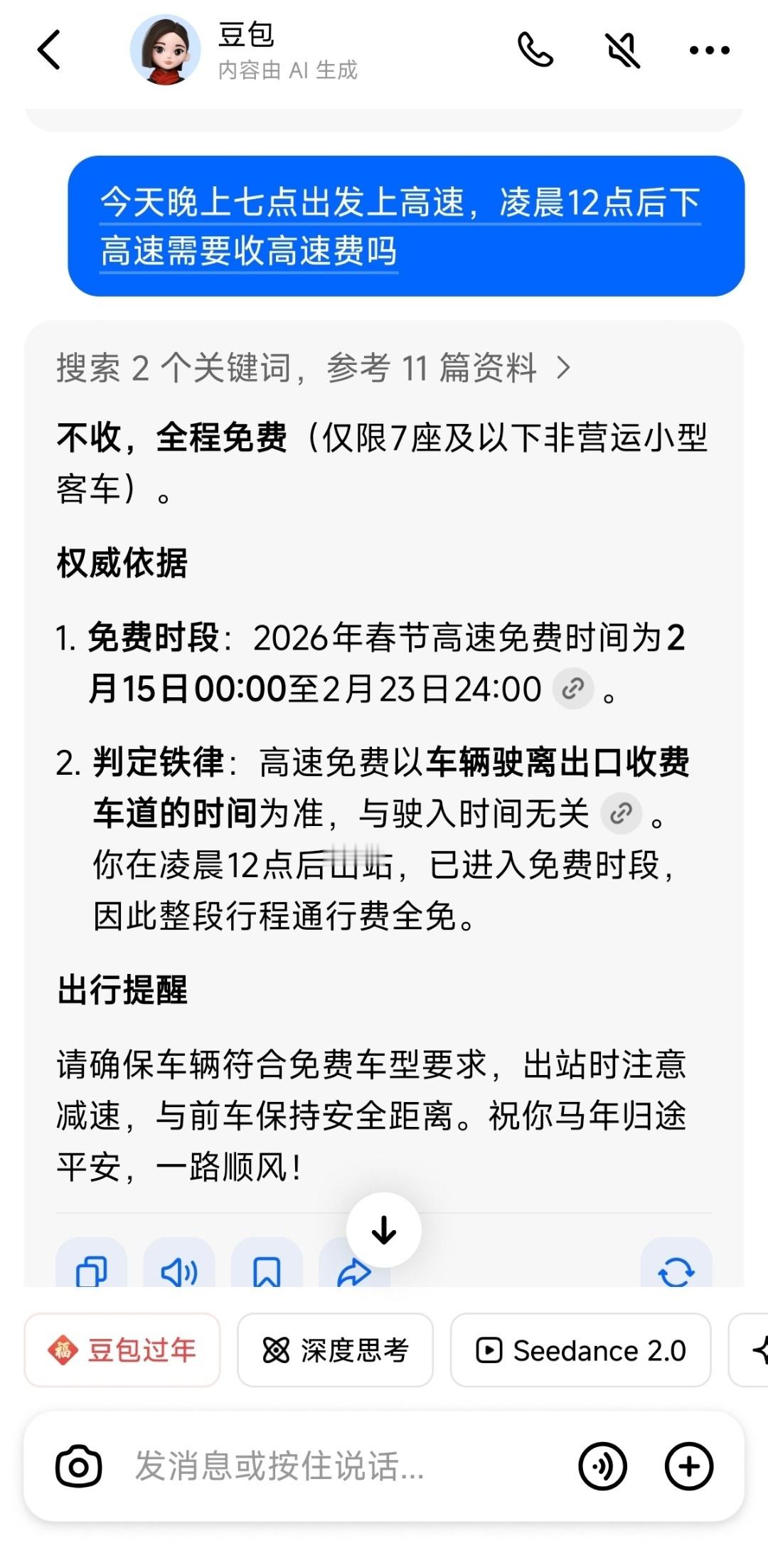 今晚 7 点上高速,夜里 12 点之后下高速,这趟行程免不免费?豆包,千问,元宝回答都不一样。春节假期小客车免费通行9天上高速拿了卡下高速时免费了怎么办