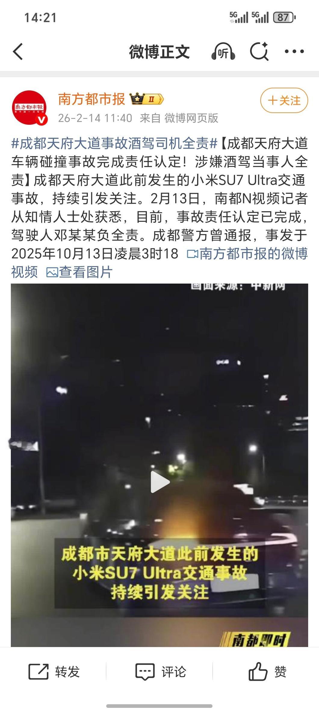 成都天府大道事故定责!醉驾+超速到200km/h,驾驶员邓某某负事故全责,就这速度的撞击动能什么超强钢车身,就是真坦克也扛不住,这已经超出正常事故的范畴了,幸好不是在白天,不然后果不堪设想