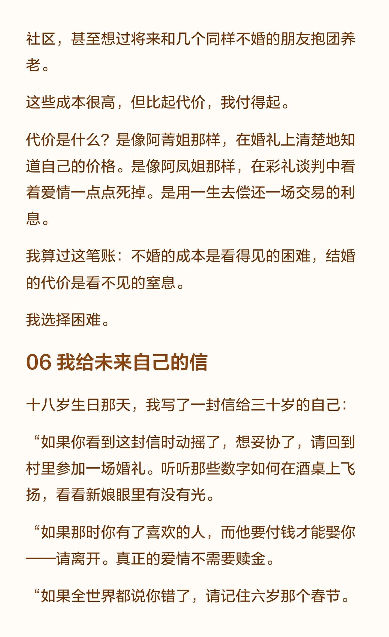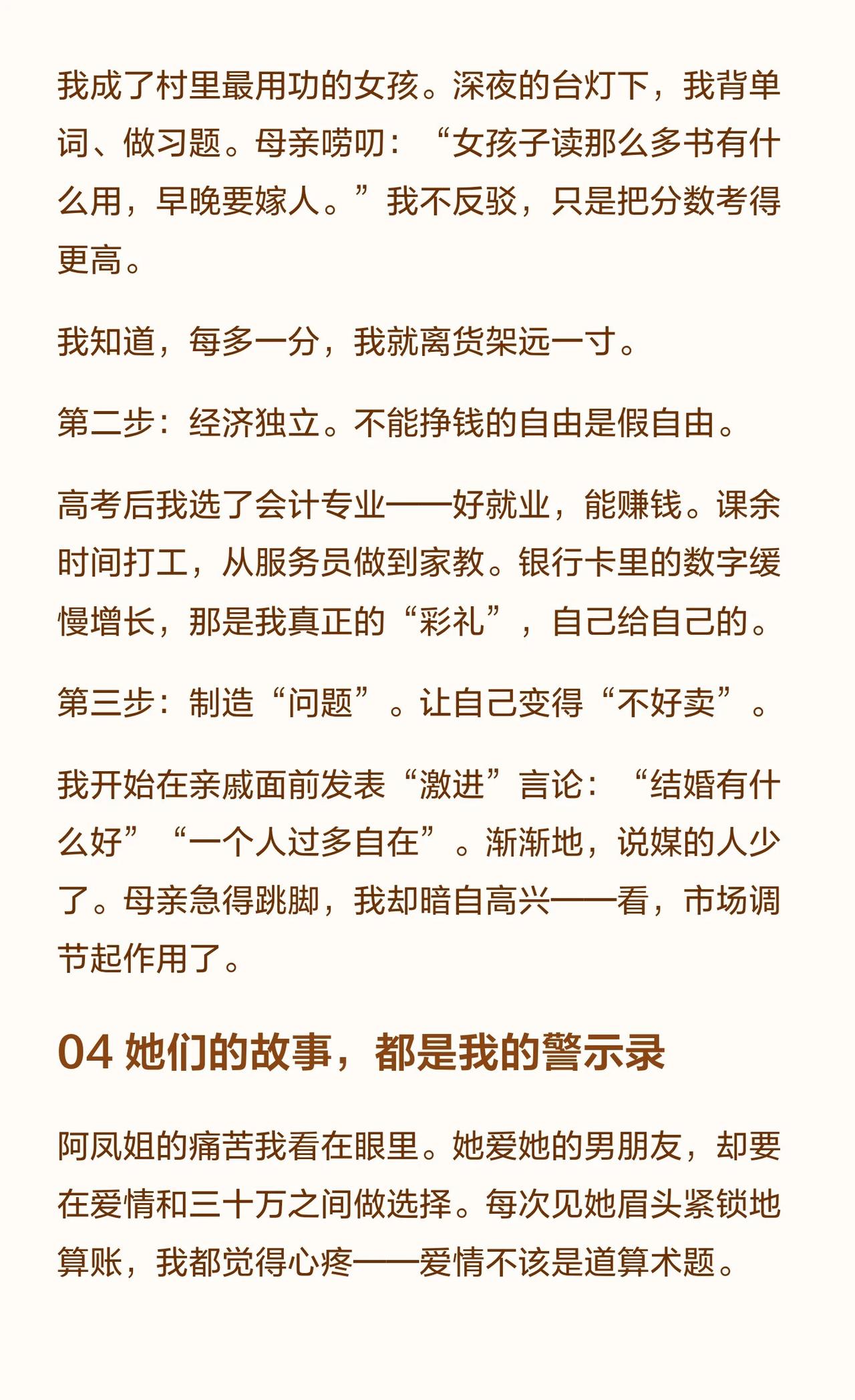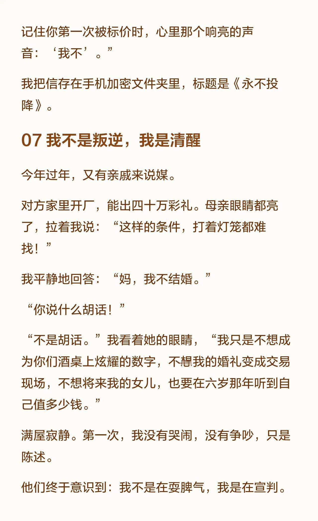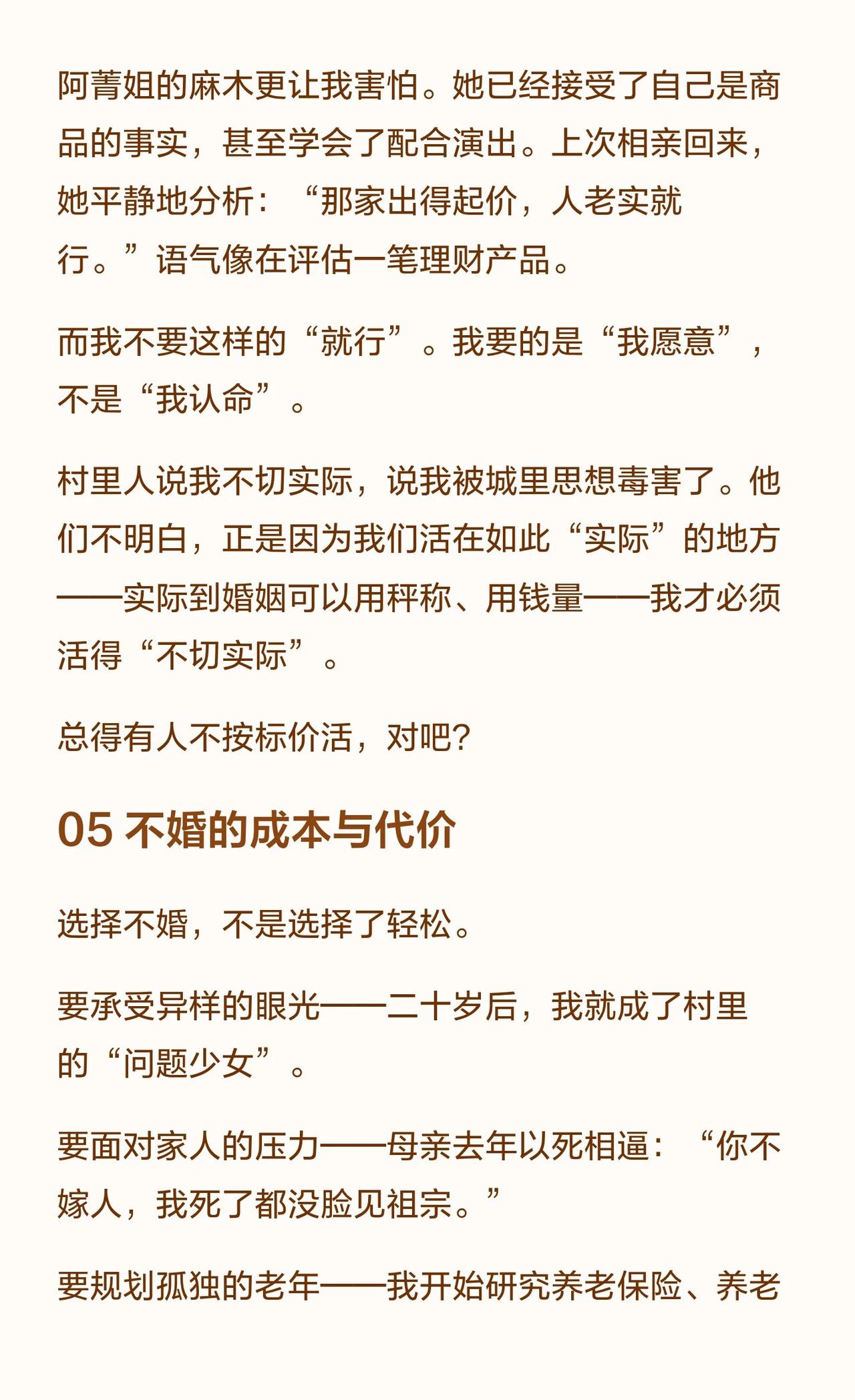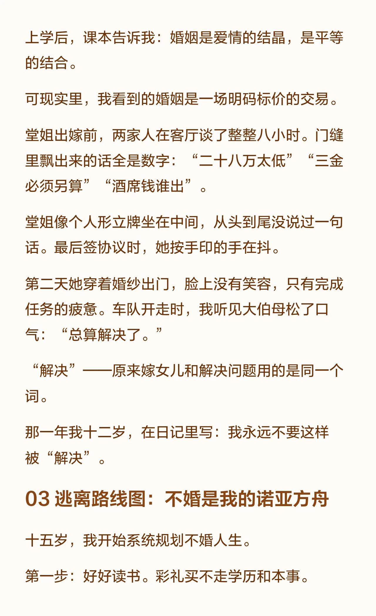 六岁时,我就决定不结婚了 我叫阿雨,19岁,是村里最年轻的“不婚主义者”。这个决定始于6岁那年,当大人们在春节饭桌上用彩礼数字“评估”我的价值时。我见过堂姐像商品一样被“解决”,见过阿凤姐在爱情与三十万间挣扎。我用读书、赚钱和“制造问题”让自己变得“不好卖”。不结婚很难,但结婚的代价,是付出一生。 不婚主义 女性独立 彩礼 农村女性 原生家庭 自我觉醒 婚恋观 成长故事 情感共鸣