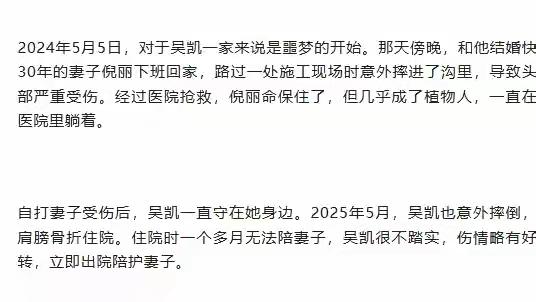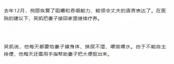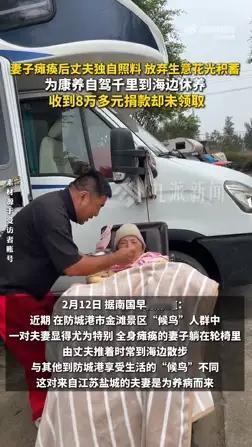 江苏盐城汉子变卖家产自驾千里,携瘫痪爱妻奔赴广西防城港金滩,海风唤醒沉睡眼神,8万善款分文未取只道人间有真情 当防城港金滩的暖阳洒在那张特殊的轮椅上,许多候鸟老人看到了爱情最坚韧的模样。丈夫吴凯缓缓推着全身瘫痪的妻子倪丽,日复一日,海浪声成了他们无声交流的背景乐。从江苏盐城到广西海边,这跨越千里的迁徙,不是为了诗和远方,而是为一个渺茫却执着的希望——唤醒挚爱。 一切始于2024年5月那个昏暗的傍晚。妻子下班途中跌入施工深沟,头部重创,虽抢回性命却陷入植物人状态。昔日经营旅游公司的老板吴凯,一夜之间褪去所有身份,只留下一个角色:丈夫。他关闭生意,花光积蓄,日夜守在病床前,甚至自己摔伤未愈就急着出院陪护。 最艰难的日常藏在指尖。无法自主排便的妻子,需要他亲手帮助抠出大便,更换尿布,擦拭身体。这些毫无浪漫可言的琐碎,他做了近两年。儿子刚步入社会,他咬牙扛下所有:“钱可以再挣,我只想她好起来。”百万元医疗费压垮家底,事故赔偿仍无着落,但这个男人没时间怨天尤人。 转机来自一句朋友的偶然提及。听说防城港冬季气候宜人,利于康养,他想起家里那辆闲置的旧房车。今年1月,他载着妻子毅然南下。海风拂面,他不停在她耳边低语,介绍风土人情。直到某天,他看见妻子眼中久违的光泽,甚至滑落一滴眼泪。“她知道,她都懂。”那一刻,所有艰辛都被泪水冲刷出意义。 他将日常拍成视频,取名“凯哥守护老婆”。没想到记录之举感动无数网友,自发捐款累计超8万元。但他始终未点接收:“精神支持就够了。”这份纯粹令无数人动容。当地居民被这份深情打动,热情邀请他们一起过年,送来果蔬。爱情不再是风花雪月,而是轮椅上的每一次颠簸,海边的每一段陪伴。 这个故事撕开了生活残酷的真相,也照亮了人性深处的不灭微光。它让我们看见,当灾难劈头盖脸砸下,仍有人用肩膀撑起一片晴空。爱情在生死考验前褪去浮华,露出最本真的内核:不离不弃的守护,是比任何誓言都沉重的担当。海风或许不能创造奇迹,但足以让两颗紧贴的心,听见彼此的跳动。 真爱无价 人间温暖 为爱坚守 (来源:南国早报)
