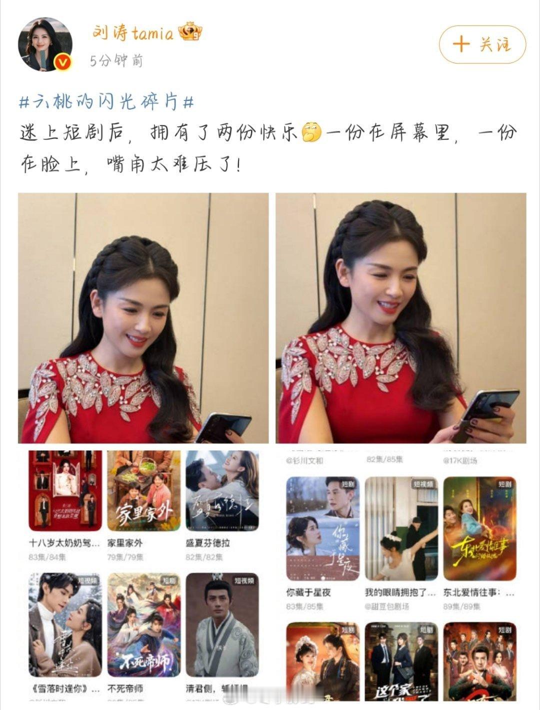 谁让刘涛看的这个 看到刘涛追短剧笑出姨母笑的样子,这不就是每天晚上的我吗,果然谁都逃不过短剧的诱惑,连刘涛也不行,以后就跟着涛姐的片单追了。