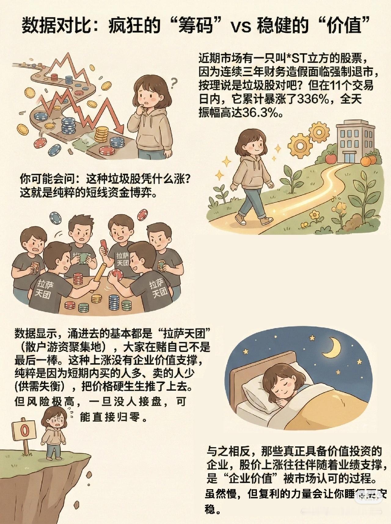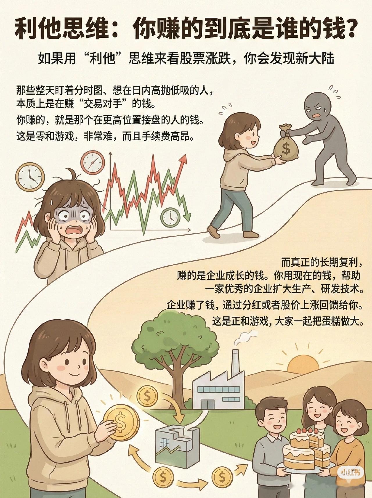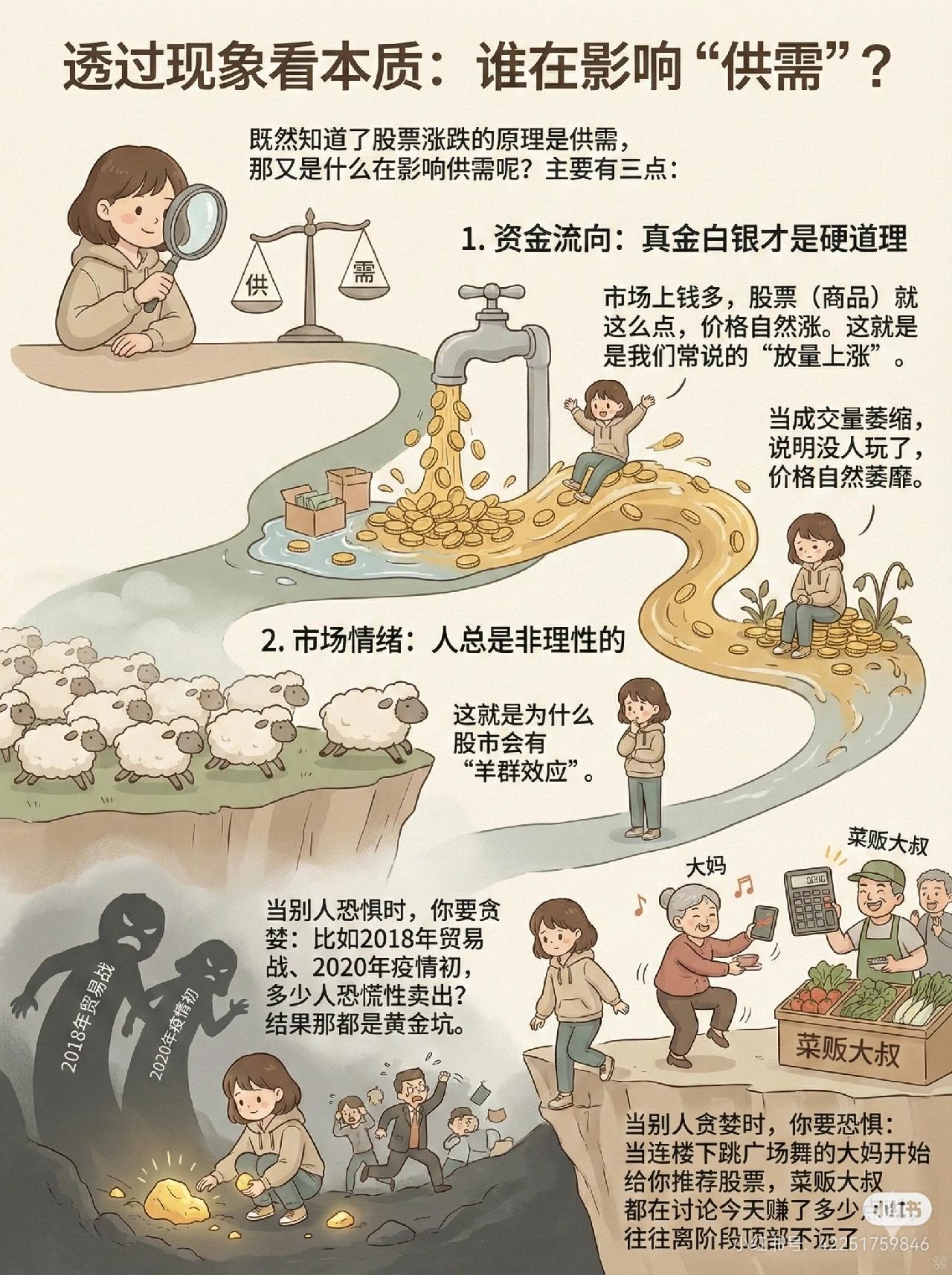 1. 股票涨跌的核心本质 股价变化遵循供需关系:买的人多(供不应求) → 上涨;卖的人多(供过于求) → 下跌。很多投资者把K线当“心跳图”,情绪化操作,但本质和菜市场买卖一样。 2. 短线博弈 vs 价值投资 - 短线资金博弈:如*ST立方,虽面临退市,但因短期大量资金涌入,11天暴涨336%,属高风险零和游戏,依赖“不是最后一棒”的接力。 - 价值投资:有业绩支撑,股价上涨是企业价值被认可的过程,虽慢,但复利稳定。 3. 影响供需的三大因素 ① 资金流向:放量上涨说明资金进入,成交萎缩则价格萎靡。 ② 市场情绪(羊群效应):非理性跟风容易形成顶部或底部,如恐慌性抛售后的“黄金坑”。 ③ 内在价值:是股价的“地心引力”,通过财报分析确定合理价,低于合理价是安全边际,高于则是高估。 4. 利他思维与投资本质 - 频繁交易是零和游戏,赚的是交易对手的钱,成本高。 - 长期复利来自正和游戏:投资优秀企业,帮其发展,企业用分红或股价上涨回馈投资者,把蛋糕做大。 一句话概括: 股票涨跌由供需决定,受资金、情绪、价值共同影响;短线博弈风险高,价值投资靠企业成长实现稳定收益,长期应以“利他”思维支持优秀企业,获得复利回报。