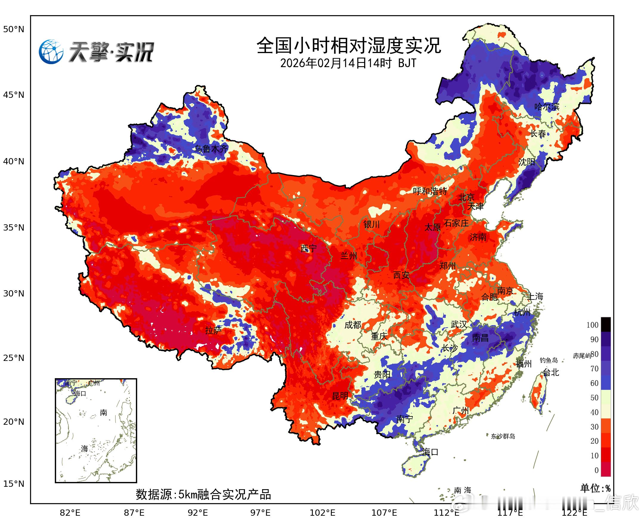 【晴朗干燥】今天我国大部地区降水稀少,主要是内蒙古东部和黑龙江西部出现降雪。南方的阴雨缩减,湖南江西多地也放晴。从高原到华北黄淮等地,下午相对湿度不足30%,部分站点甚至低于10%。比如:山西平顺4%、河北涉县7%、河南栾川8%、陕西黄龙8%、青海西宁8%。