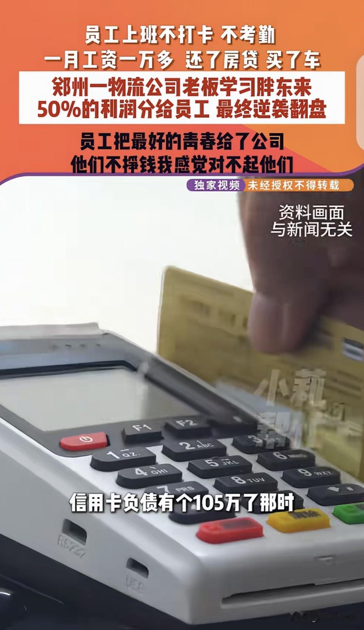 “活该你发财!”河南郑州,一男子创业失败,信用卡负债105万,他绝望了,2次想轻生,可自己有上有老下有小死不起,他决定拼一把,开了家物流公司,学习“胖东来”,把50%利润都给员工,最终逆袭翻盘,不但把债还完,资产也变成正数,员工们每月能挣10000多,上班不打卡不考勤,还了房贷买了车。男子:员工把最好的青春给了公司,他们不挣钱我感觉对不起他们。 于先生,曾经就是个普通货车司机,每个月拿着5000块左右的工资,日子虽然不富裕,但一家老小围在身边,也算安稳。 可他心里总憋着一股劲儿,想着自己还年轻,不能就这么一辈子给别人打工,得拼一把,让家人过上更好的日子。 于是,于先生咬咬牙,辞了货车司机的工作,一头扎进了创业大潮里。他满心期待,觉得只要自己肯吃苦、肯努力,肯定能闯出一片天。 可现实却给了他狠狠的一记耳光。创业哪有那么容易啊,市场行情变幻莫测,资金周转困难重重,竞争对手又多又狠。 没几年功夫,于先生的生意就撑不下去了,不仅把之前攒的那点家底全搭了进去,还欠下了105万的外债。 那段时间,于先生整个人都垮了。信用卡的还款提醒像催 命符一样,每天都在他耳边响个不停。 他不敢回家,不敢面对家人那充满期待又逐渐失望的眼神。最绝望的时候,他甚至2次走上了楼顶,站在边缘,望着下面车水马龙的世界,心里想着,跳下去就一了百了了。 可一想到家里上有老下有小,自己要是死了,他们可怎么办啊?这债谁来还?孩子以后的生活谁来管?想到这些,他又硬生生地把脚收了回来,瘫坐在地上,嚎啕大哭。 就在于先生觉得生活彻底没了希望的时候,他偶然走进了胖东来超市。一进去,他就被里面的氛围给吸引了。 员工们个个精神饱满,热情地招呼着顾客,脸上洋溢着幸福的笑容。于先生很好奇,这超市到底有什么魔力,能让员工这么开心地工作? 他开始留意胖东来的经营模式,发现这里不仅商品质量好、服务周到,更重要的是,老板把大部分利润都分给了员工,让员工真正成为了企业的主人。 于先生心里一动,他想,自己是不是也能学学胖东来呢?虽然心里没底,但他还是决定拼一把。 他开了家物流公司,他做出了一个大胆的决定:把公司利润的50%分给员工,而且实行不打卡、不考勤的弹性工作制。 一开始,员工们都懵了,不敢相信这是真的。可慢慢地,他们发现于先生是认真的。大家开始拼命工作,不仅效率提高了,还主动帮公司出谋划策,解决各种难题。公司的生意越来越好,利润也节节攀升。 就这样,于先生靠着分钱模式,绝地求生,不仅还清了105万的外债,还让公司的资产变成了正数。 员工们每月能挣10000多,不少人还还了房贷、买了车。 于先生常说:“员工把最好的青春给了公司,他们不挣钱我感觉对不起他们。”现在,他的物流公司越来越红火,于先生也终于实现了自己的梦想,让家人过上了好日子。 有人说,老板天天告诉我们今年公司亏了多少钱,结果他上一年买了一套房,今年买了一辆法拉利。 说明人只要有激励,就可以发挥超越自己的状态,抠门老板得到的只能是敷衍,当一天和尚装一天钟的平庸之辈。人心换人心,你对员工好,工资到位,员工比老板还怕没生意。 我们物流老板说一年能挣70万就是缺少人干活让我们交钱入股,我们就交了,每天每夜的忙,年底分账时老板说赔了,别说分红了本钱都被老板收了,老板却买了五六十万的车。 我觉得所有的老板们应该这样想:感谢父母,让我拥有智慧。感谢国家,让我有机会出人头地。感谢员工,让我有自豪感。所以我要带着大家一起过好日子,开心! 对此,你怎么看? 欢迎关注@一案一论