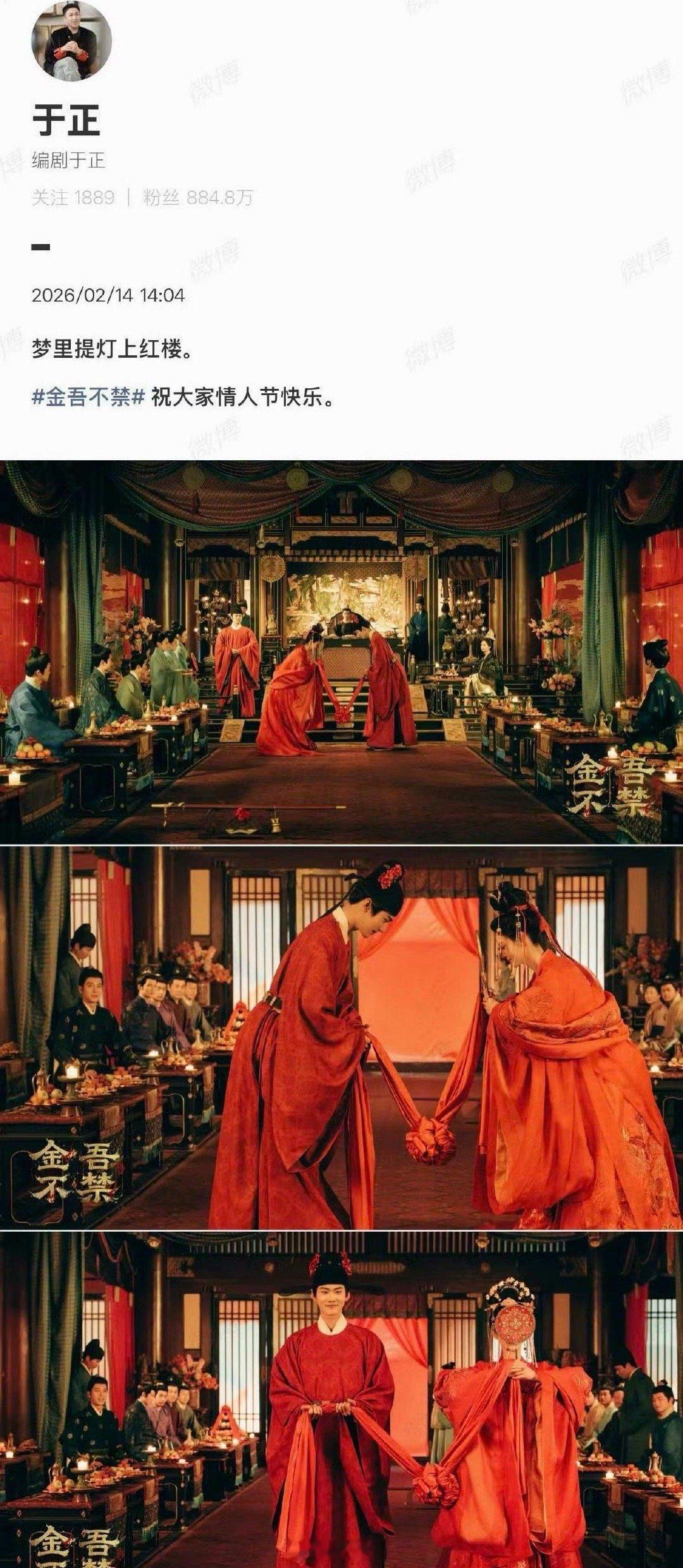 于正晒周柯宇赵晴大婚照还真别说于正的情人节仪式感有点意思啊,于正晒了周柯宇、赵晴在《金吾不禁》的新剧照。祝网友情人节快乐。周柯宇和赵晴的红妆造型,看起来很是般配,于正在古偶剧的审美,一直在线啊~周柯宇赵晴情人节大婚剧照