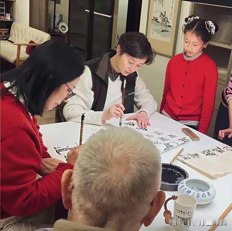 吴越这一家子也太有爱了吧! 小侄女穿着红毛衣本来就喜庆,还跟姑姑长得挺像,简直就是迷你版吴越。 最逗的是看姑姑写字写得高兴,居然手舞足蹈起来,这画面感太强了,可爱到犯规! 全家都练书法这事儿也太文艺了,过年不刷手机不抢红包,围在一起写字,这年过得真有味道。 小朋友在这种氛围里长大,耳濡目染的都是文化,真好。