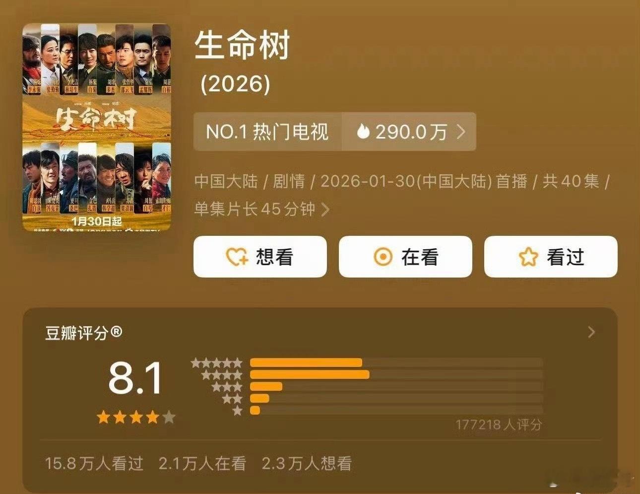 《生命树》这部剧没火真的很可惜!!好在豆瓣17万人打分8.1分也算是给了它最好的证明,观众的眼睛是雪亮了。杨紫这部剧感觉值得一个奖,演的太好了非常让人共情,绝对95🌸演技天花板,好饭不怕晚,推荐去看!!!!!!