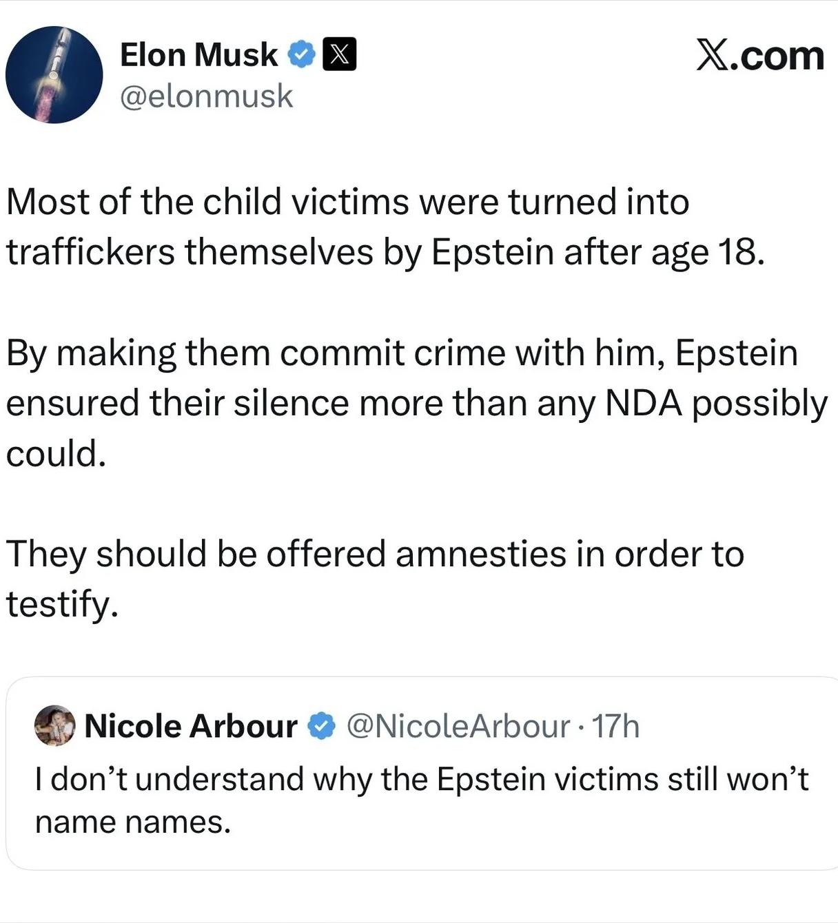 真相来了, 为什么爱泼斯坦的受害者不敢举报,马斯克说出了真相。 那些被爱泼斯坦伤害的未成年受害者,等年满18岁后,大多被他硬生生转变成了交易的参与者。 这些受害者大多是十几岁的孩子,有的出身贫困,被“高薪工作”“学费赞助”诱骗,有的甚至是被自己的亲人或朋友出卖。 她们年纪小,不懂人心险恶,被伤害后要么被威胁,要么被金钱控制,根本没有反抗的能力。 更恶毒的是,爱泼斯坦从不打算给她们留退路,等她们成年后,就会用之前的伤害作为把柄,逼迫她们参与到后续的交易中,让她们从“受害者”变成“共犯”。 试想一下,一个女孩从十几岁就被操控,成年后还被迫继续作恶,她怎么敢站出来举报?一旦举报,不仅要揭开自己年少时的伤疤,还要面临“共犯”的指控,被贴上“不洁”的标签,遭到社会的污名化; 更可怕的是,爱泼斯坦背后的权贵们,有的是钱和势力,能轻易打压、报复她们,甚至让她们在这个世界上“消失”。 就像最近有几位女性站出来发声,却被质疑“动机不纯”,还有人担心她们会遭到诉讼,连保守派评论员都在质疑她们为何不公开加害者的名字,殊不知,她们的每一步都如履薄冰。 也正因如此,马斯克才公开表态,愿意为任何敢说出真相、却因此遭到起诉的受害者支付辩护费用,就是想帮这些沉默的女孩打破枷锁。可即便如此,敢于站出来的人还是不多,除了上述的顾虑,还有一个重要原因——美国司法系统的纵容。 爱泼斯坦案曝光后,司法部公开了数百万页文件,却有大量核心内容被涂黑,涉案的权贵们要么矢口否认,要么被从轻发落,就像最近被卷入丑闻的美国商务部长卢特尼克,明明多次和爱泼斯坦往来,却谎称“仅有三次接触”,即便被揭穿,也有白宫撑腰,依旧稳坐高位。 爱泼斯坦的恶行,从来都不是他一个人的罪孽,而是整个权贵圈和司法系统的共谋。那些受害者的沉默,不是懦弱,而是被逼无奈; 马斯克点破的真相,也不是什么惊天秘密,而是被权贵们刻意掩盖的肮脏现实。直到现在,爱泼斯坦案还有太多的疑点没有解开,还有太多的受害者在黑暗中挣扎,我们能做的,就是记住这些沉默的声音,追问真相,哪怕这条路再漫长,也要让作恶者付出应有的代价,让那些受伤的女孩,能有机会重见光明。