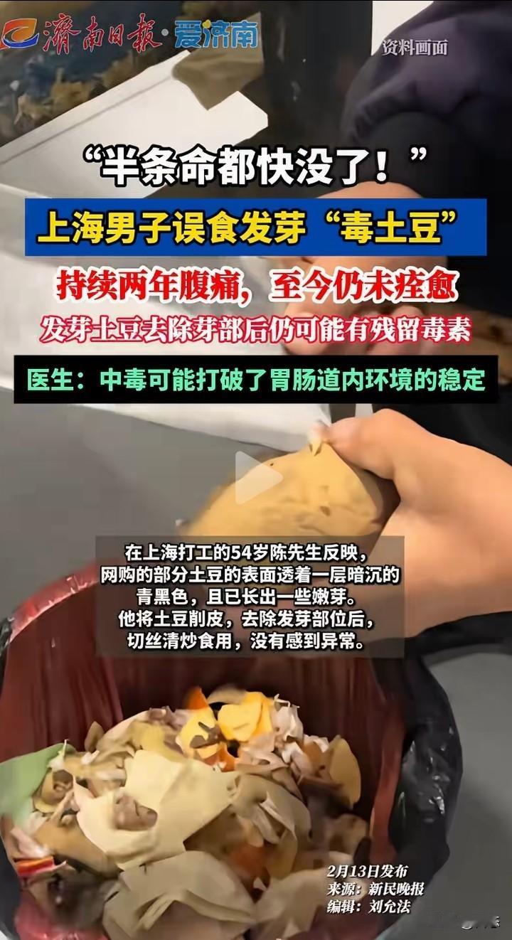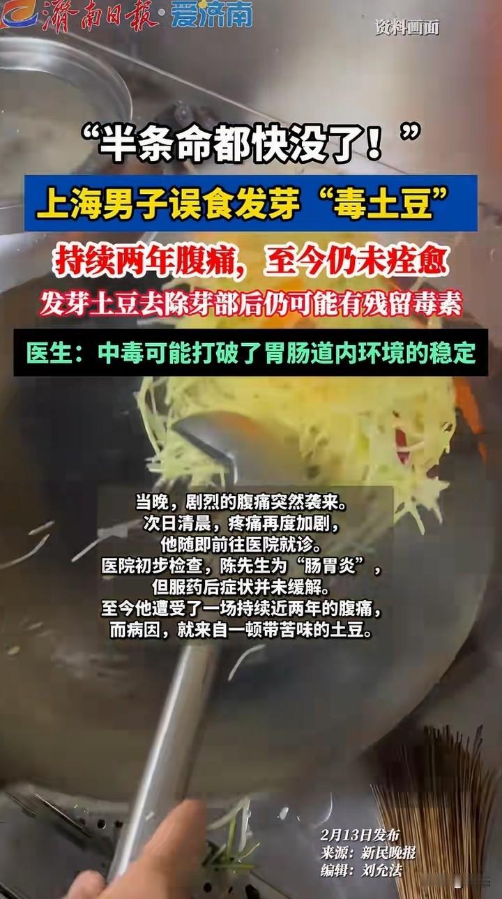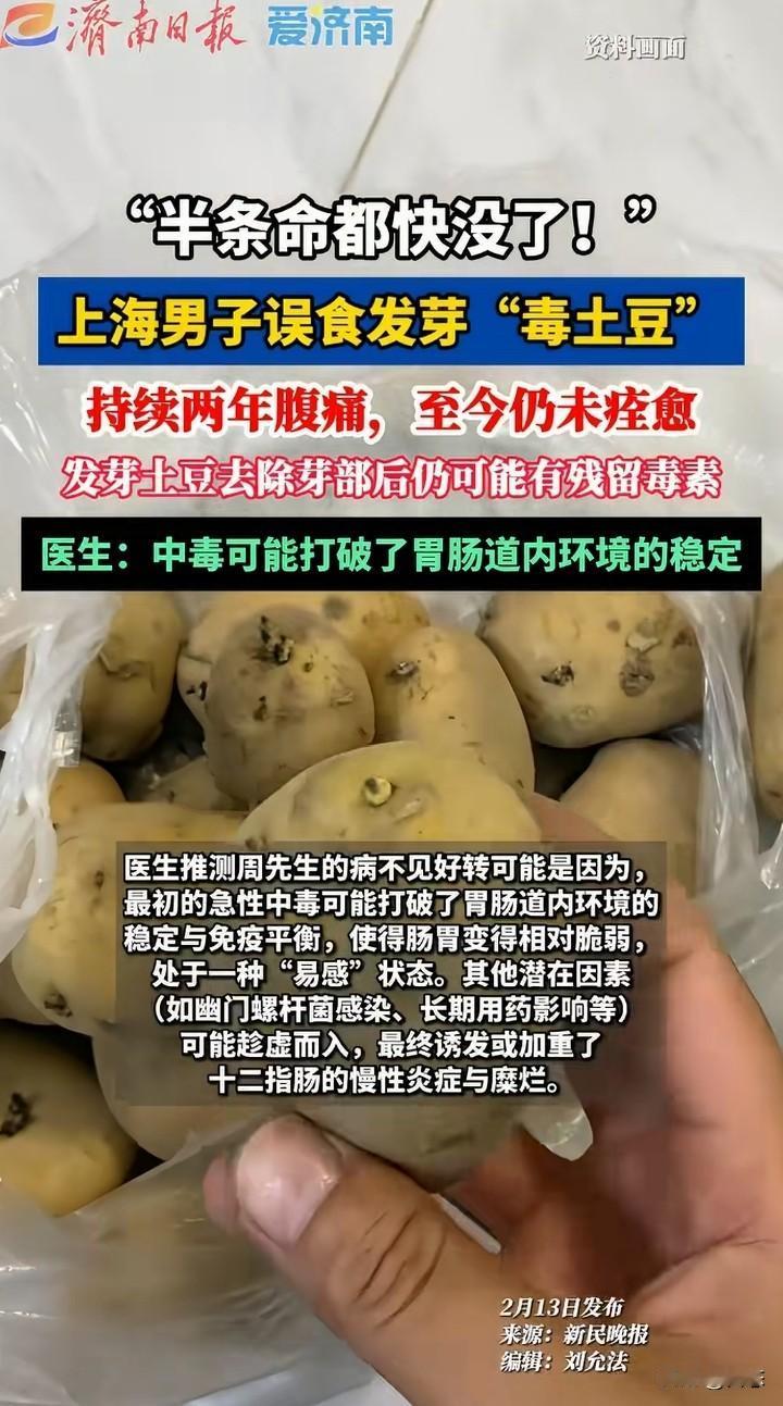 太吓人了,上海一男子误食发芽的土豆,持续两年腹痛,至今仍未痊愈。 在当晚剧烈的腹痛突然来袭,次日凌晨,疼痛再度加剧,他随即前往医院就诊。医院诊断男子为肠胃炎,但是服药后症状还没有得到缓解。至今男子还在遭受一场持续两年的腹痛,而病因就是来自带苦味的土豆。 医生提醒,带芽的土豆去除芽部后仍可能有残留毒素。中毒可能打破胃肠道的内部环境。 看到很多网友评论,他们都多多少少吃过带芽的土豆,说实话,反正我没吃过,个人认为尽量不要吃的好。 你们怎么看呢?