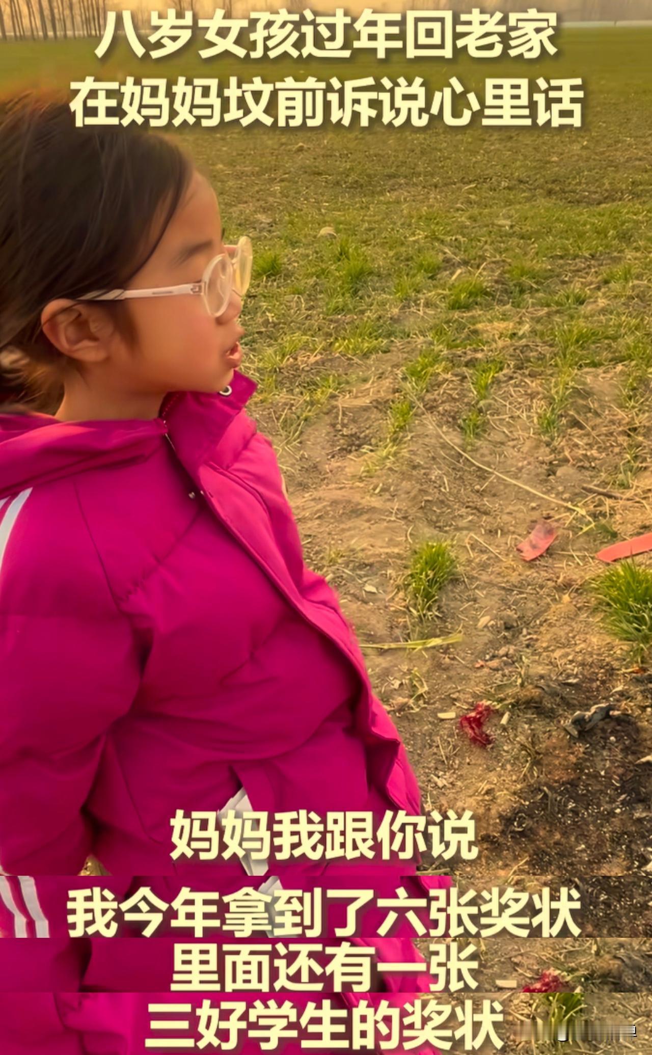 破防!8岁女孩坟前哭诉:拿了6张奖状,却再也等不到妈妈的夸奖 这一幕太让人心疼了,女孩在妈妈坟前哭诉说拿了6张奖状,却在最想炫耀的人面前,哭得那么难过。 看了人民日报和新华网报道的这个视频,瞬间泪目。近日在安徽亳州,8岁女孩过年回老家时,在妈妈坟前哭诉,说自己今年拿到了6张奖状,其中还有一张“三好学生”奖状。 但她看到别的同学拿到奖状后,爸爸妈妈会在校门口开心地迎接,而自己的奖状妈妈却再也看不到,也没人像妈妈一样奖励她,因此觉得“拿奖状也没意义”。 过年本是阖家团圆的日子,这个8岁女孩,却在妈妈的坟前,说出了让无数人瞬间泪崩的话: “妈妈,我想跟你说,我今年拿了6张奖状,里面还有一张‘三好学生’的奖状呢……” “我看见人家爸爸妈妈,接到孩子了,一看人家拿到奖状了,都开心得很,可是我觉得拿奖状也没意义,你也看不到了,也奖励不了我……” 这六张奖状,是她一年攒下的所有骄傲,也是她以为能送给妈妈最好的“新年礼物”。可当她跪在坟前,把奖状一张张展开,想给妈妈看的时候,她才突然明白,无论她多么努力,妈妈再也不能抱抱她、夸夸她了。 那一瞬间,她所有来撑起自己的坚强,都崩溃了。她不是觉得努力没有意义,而是这份喜悦和想念,再也找不到那个最想分享的人。 女孩3岁时,妈妈就永远离开了她。这些年,她跟着姑姑长大,姑姑没什么文化,还要照顾其他孩子,女孩的学习全靠自己咬牙坚持。 坟前的风很冷,女孩的哭声很轻,却重得像一块石头,砸在每个人的心上。 这个世界上,有些爱,即使跨越生死,也从未缺席。愿这个坚强的女孩,带着妈妈的期许,在未来的路上,永远被爱包围,永远闪闪发光。 孩子,虽然妈妈的怀抱不在了,但她一定在某个地方,为你六张沉甸甸的奖状感到无比骄傲。希望你哭过之后,能被世界温柔以待。