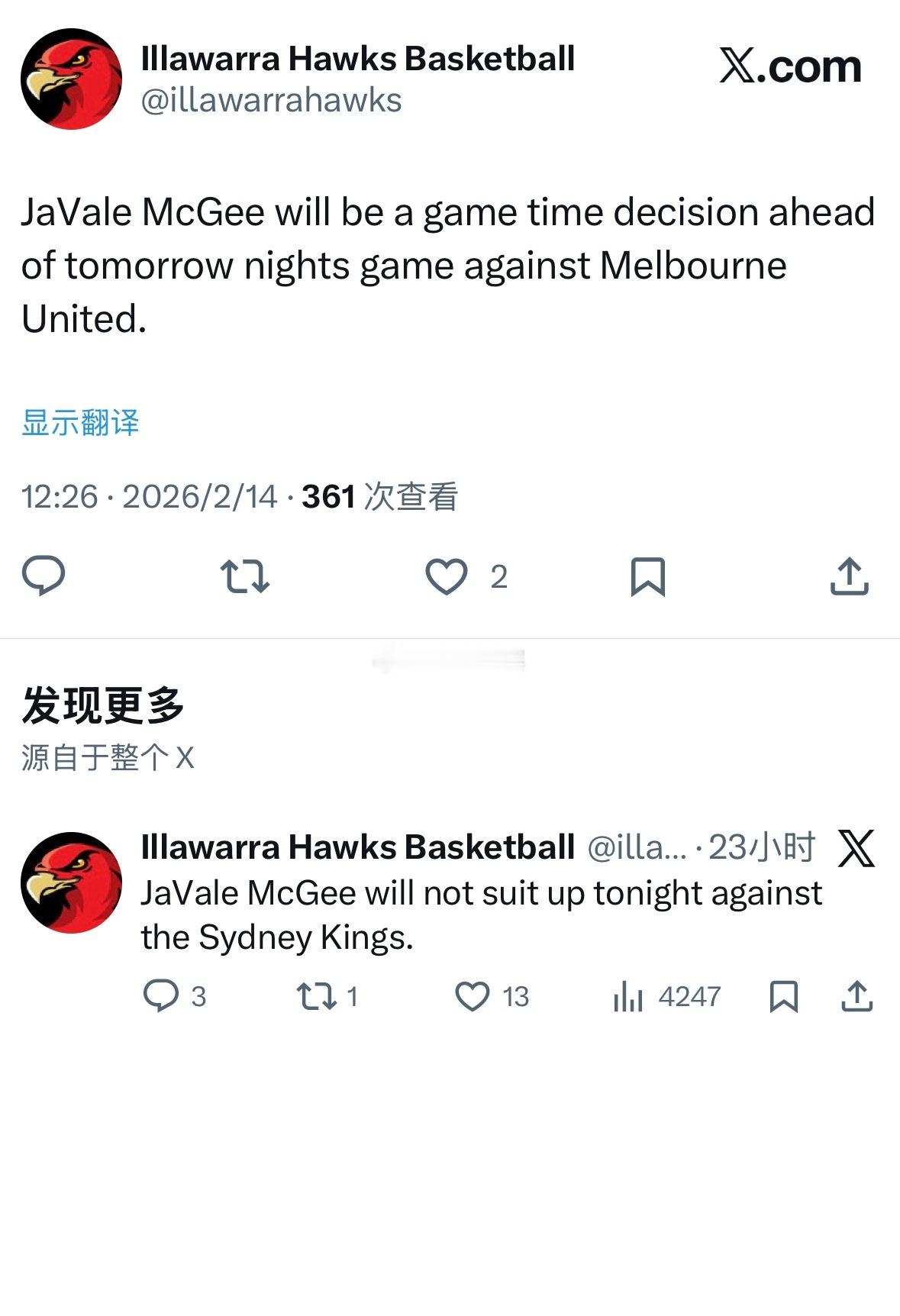 伊拉瓦拉老鹰队官方:贾维尔·麦基能否出战明晚对阵墨尔本联队的比赛,将取决于赛前决定。