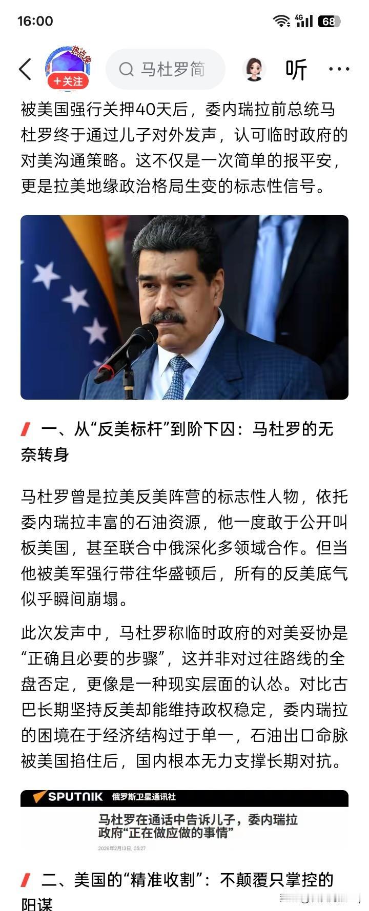 不过如此? 据有消息说,在被美国关押的委内瑞拉总统马杜罗,通过他的儿子表示,他认可委内瑞拉临时政府与美国进行的沟通,称临时政府对美国的妥协是“正确且必要的步骤”。说是沟通,估计委内瑞拉临时政府远远不是与美国沟通那么简单,如果说是妥协,或许还有那么点样子。 但无论如何都说明了马杜罗对美国的态度和立场都有了显著的变化,他似乎正在重新认识美国。当然,或许马杜罗在被美国关押期间的待遇,完全出乎他的意料之外,才让他诱使和萌生了新的认识。 委内瑞拉也有被关押的著名政治人物,对这些政治犯的待遇,估计马斯克也略知一二。