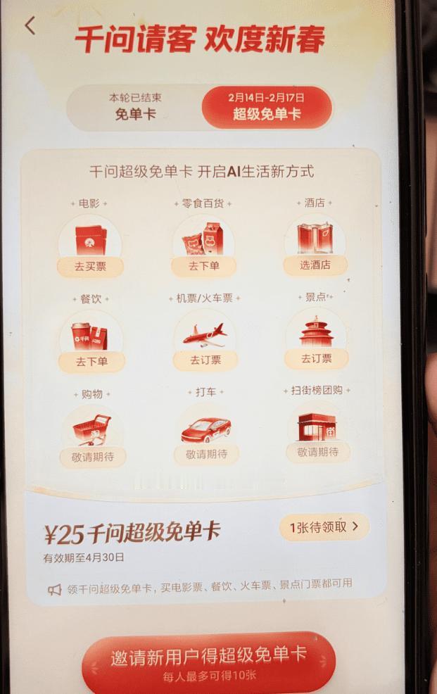 【千问超级免单卡再次光临】家人们,谁懂啊!千问这波福利太绝啦! 我刚用它买了春节档《惊蛰无声》的电影票,用超级免单卡直接抵扣,省了25块呢!这卡使用范围超广,点奶茶外卖这些AI订餐不在话下,买电影票、订酒店和门票也轻松搞定。 新用户打开千问APP就能领一张,邀请新朋友,双方还能各得一张。而且这卡有效期到4月30日,年后都能接着用。之后还会上线AI打车、充话费等功能,都能用这卡。 活动就三天(2.14 - 2.17),想薅羊毛的宝子赶紧冲,打开千问APP领卡,享受这波福利呀!🥰