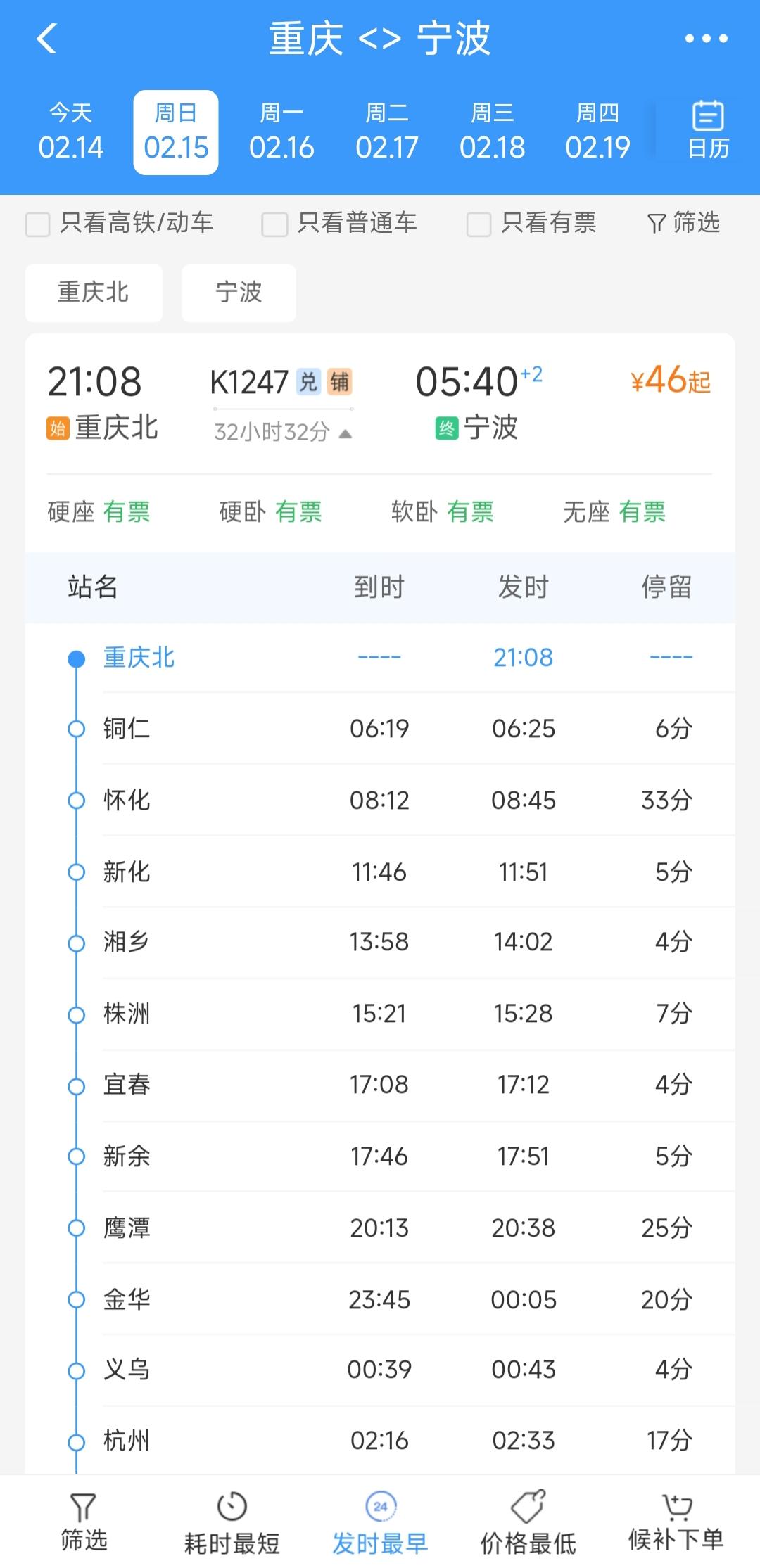 真没想到从重庆到宁波乘坐K1247次绿皮车票价只有46元,看到这里我确实有些震惊。毕竟重庆到宁波大约有1700多公里路程,因此这趟绿皮车对于外出打工人员以及中老年人来说还是很受欢迎的。 不过大家也没有必要太开心,因为15号是最后一天,从16号开始重庆到宁波的绿皮车将恢复到236元的价格,2折的优惠到此为止,因此最近川渝地区人想要坐便宜的绿皮车到浙江还是要抓住最后的机会。