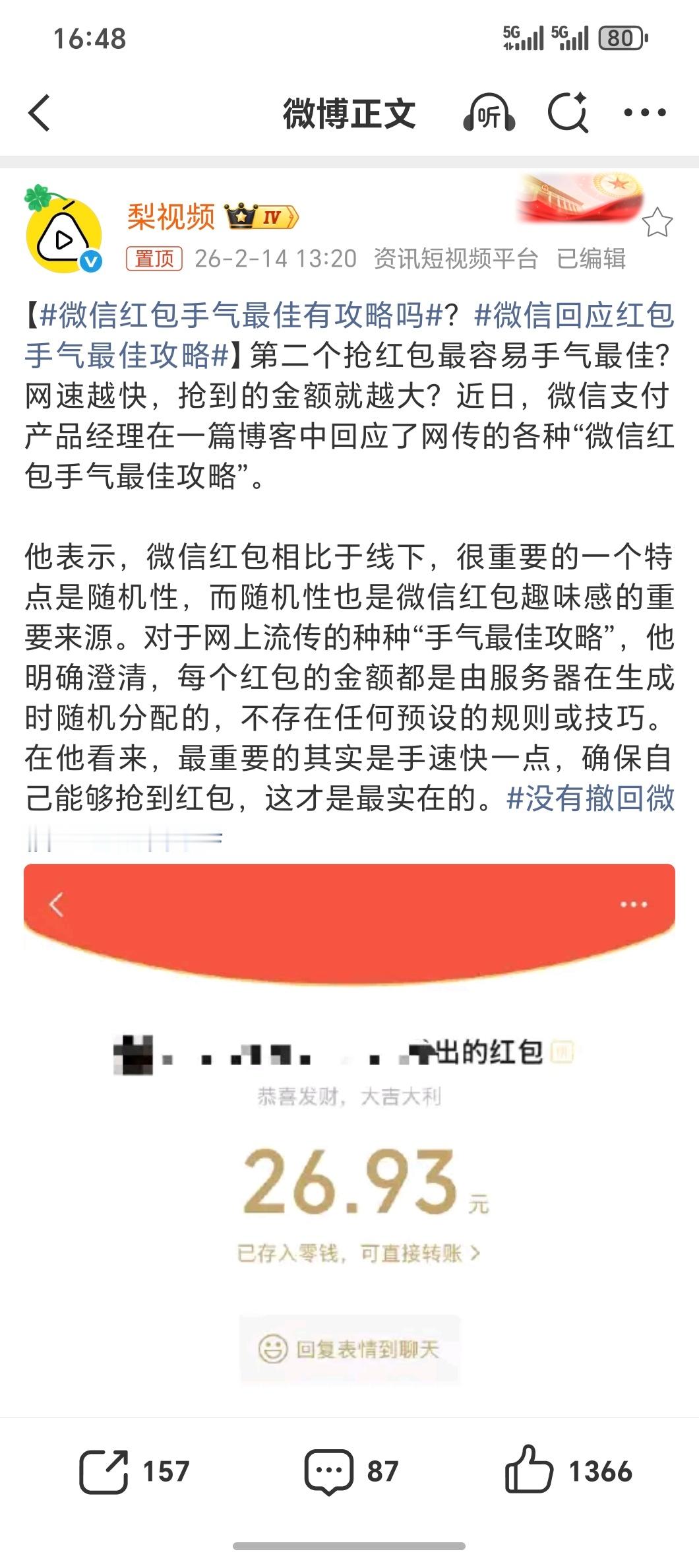 微信回应红包手气最佳攻略微信抢红包攻略出过很多次了其实结论就是「没有攻略」相比抢到手气最佳,抢到最重要朋友们说对不对?