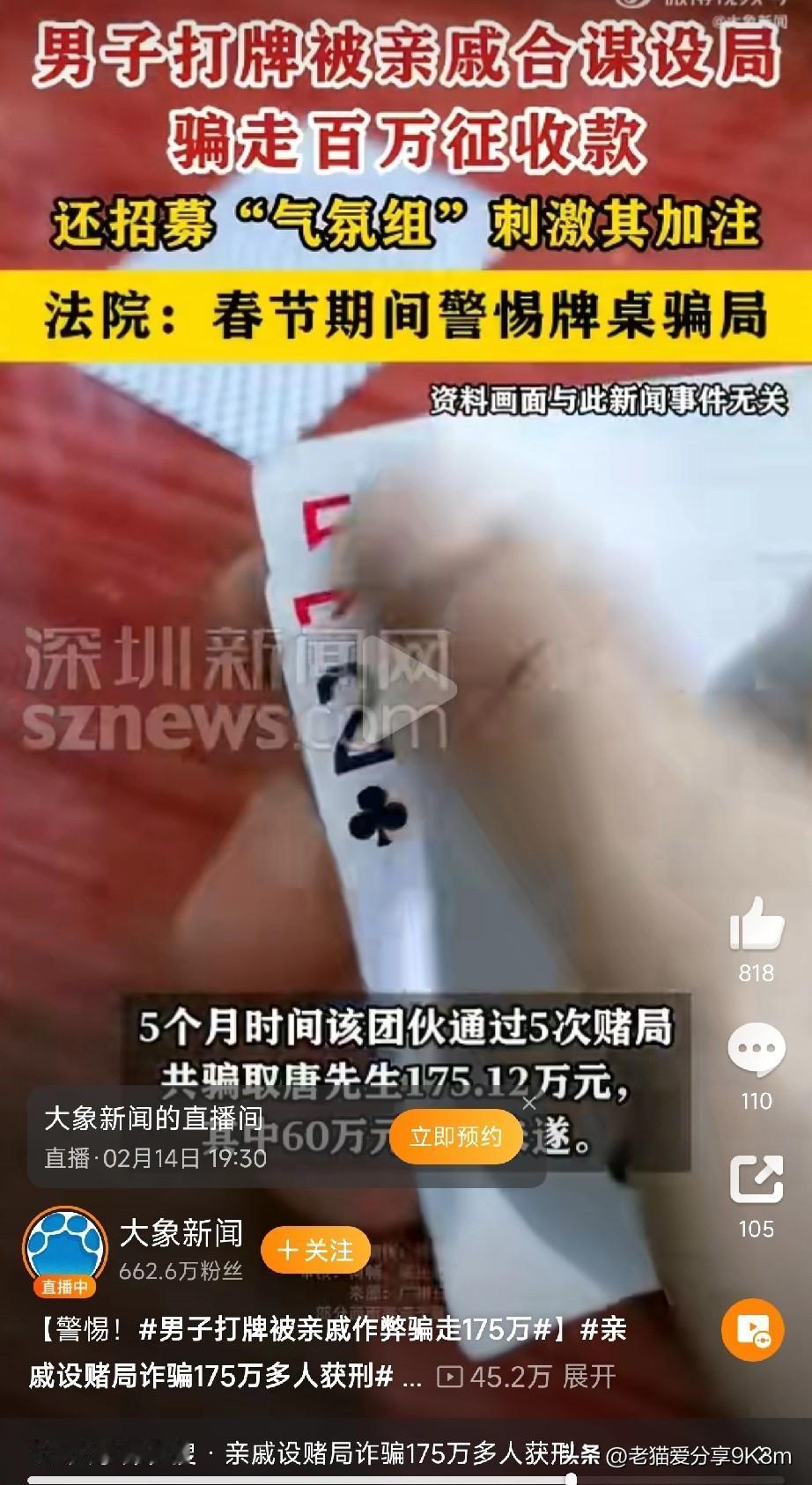春节打牌千万要长点心眼! 近日曝出一起惊天骗局:男子唐先生被亲戚周某甲盯上,设下“杀猪盘”赌局,5个月骗走175万!连牌桌上的“笑容”都是演的,简直细思极恐… 原来,周某甲得知唐先生拿到数百万元拆迁款后,立马打起歪主意。勾结同伙周某乙、严某等人,利用唐先生爱打牌的习惯,组了个“作弊天团”: 暗做手脚:提前码牌、做标记,偷看换牌,把赌局变成“剧本杀”; 气氛组助攻:牌桌上安排“托儿”假装牌友,故意输钱哄唐先生上头,再激将法逼他加大赌注; 层层下套:从几百块到一局十几万,短短5次赌局,骗走唐先生175.12万元(还有60万因唐先生没钱未遂)! 你看扎心吧,你把他当亲戚,他把你当待宰的“肥羊”!唐先生直到被催债才醒悟,原来牌桌上的“好运”都是假的… 近日,长沙市望城区法院宣判:主犯周某甲因诈骗罪被判12年,同伙也领刑3至12年不等,并处罚金!网友怒赞:判得好!对这种“吃相难看”的亲戚绝不姑息! 牌桌陷阱多:亲戚邀牌局,若有人不停劝你加大赌注、搞“激将法”,立刻警惕! 赌局无运气:若发现对方作弊(码牌、换牌、暗号等),果断离场并报警! 守住底线:小赌怡情,大赌可能倾家荡产!别让“过年热闹”变成“年终悔恨”! 真是防人之心不可无,牌桌千万别上头! (文章素材来自大象新闻,侵删)