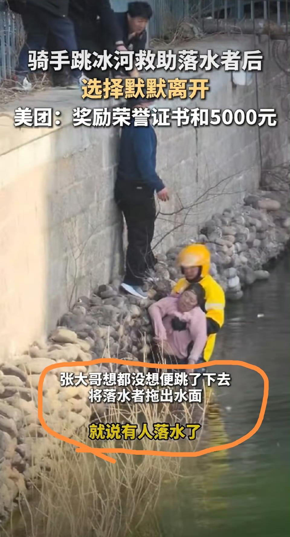 对于救人的奖励,美团这样的简单直接挺好的。给予救人外卖小哥荣誉证书外加5000元奖励,说实话这么冷的天气不是每一个人都有下水救人的勇气。 像这种拥有几十万员工的大企业积极鼓励员工正能量,对于整个社会都非常有意义。 因为买卖小哥无论白天还是黑夜流动于社会的大街小巷之中,鼓励他们在保障自身安全的前提下救人助人,这就是一股无法忽视的正能量大部队。 夸奖是必须的,但是5000元物质奖励很接地气更要点赞。