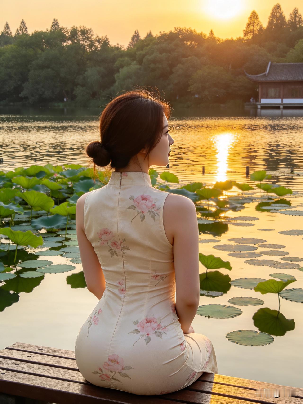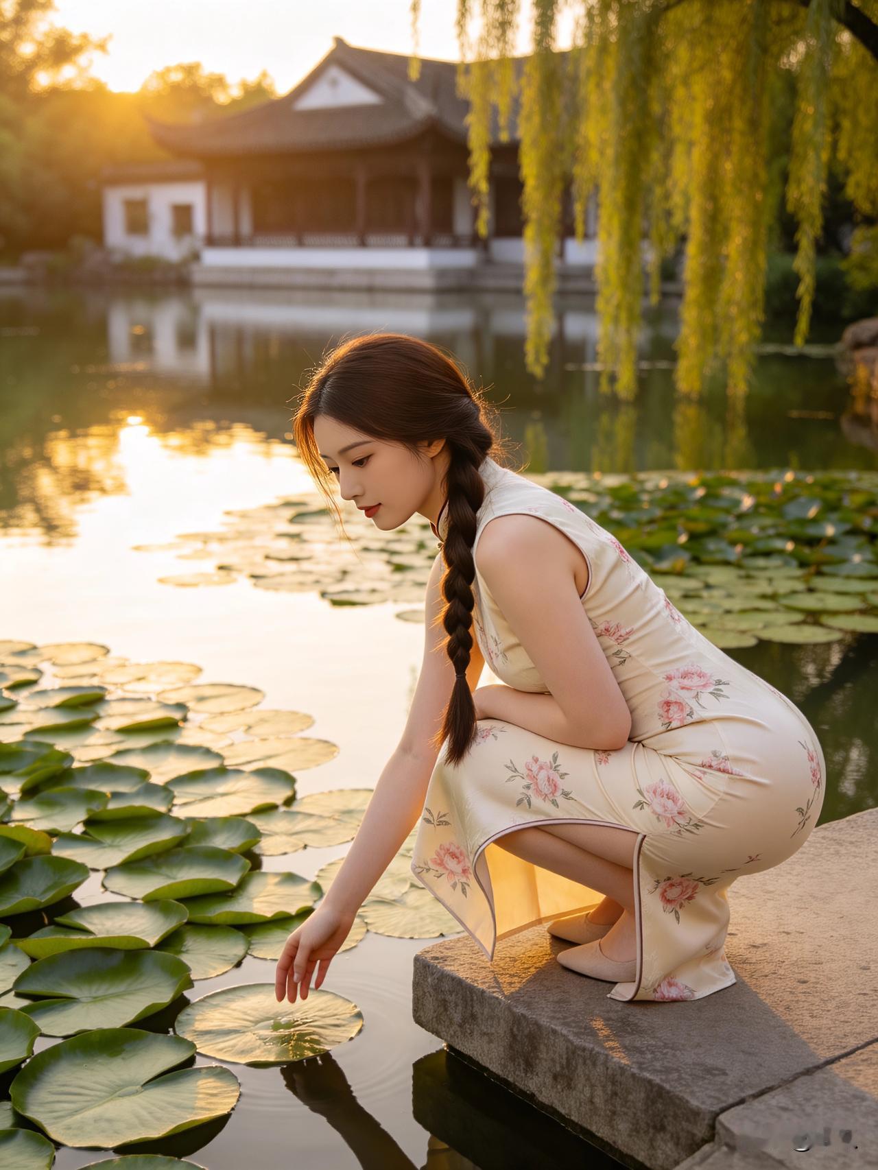江南的风,吹得人心都软了🌿 夕阳把湖面染成了暖金色,我踩着青石板,在荷塘边慢慢走。 浅米色的旗袍裹着曲线,风一吹,裙摆轻轻晃;麻花辫垂在身后,连笑容都带着荷香。 这样的江南,谁能不心动呢? 旗袍写真 江南氛围感 新中式穿搭 国风美永不过时 湖边拍照 治愈系风景 夏日ootd